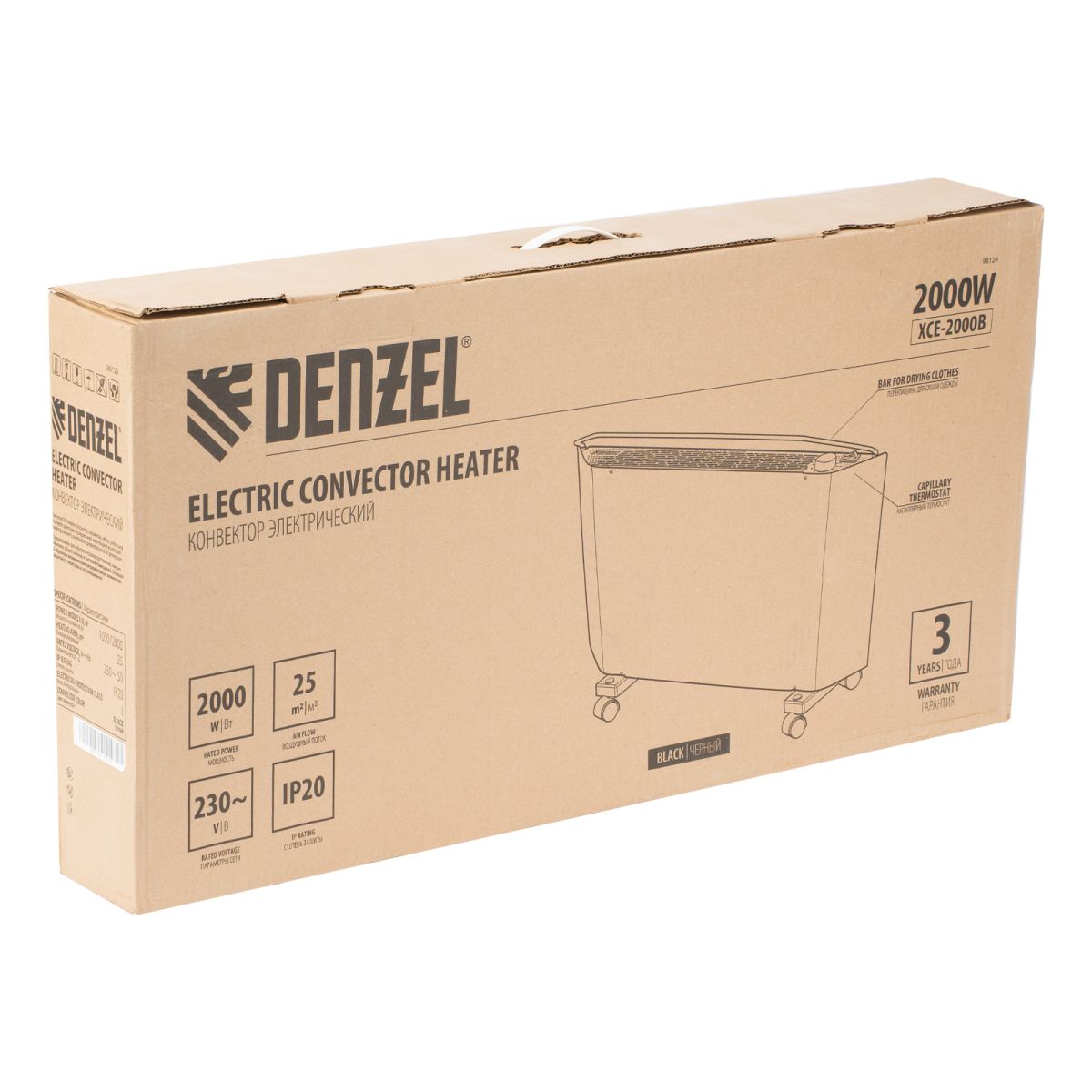 Электрический конвектор Denzel XCE-2000B 98129 черного цвета, максимальной мощностью 2000 Вт, с сушилкой для одежды, колесами и X-образным нагревательным элементом, работает от сети 230 В и предназначен для обогрева закрытых помещений площадью до 25 м2. Надежный и долговечный X-образный нагревательный элемент обеспечивает быстрый нагрев до необходимой температуры.