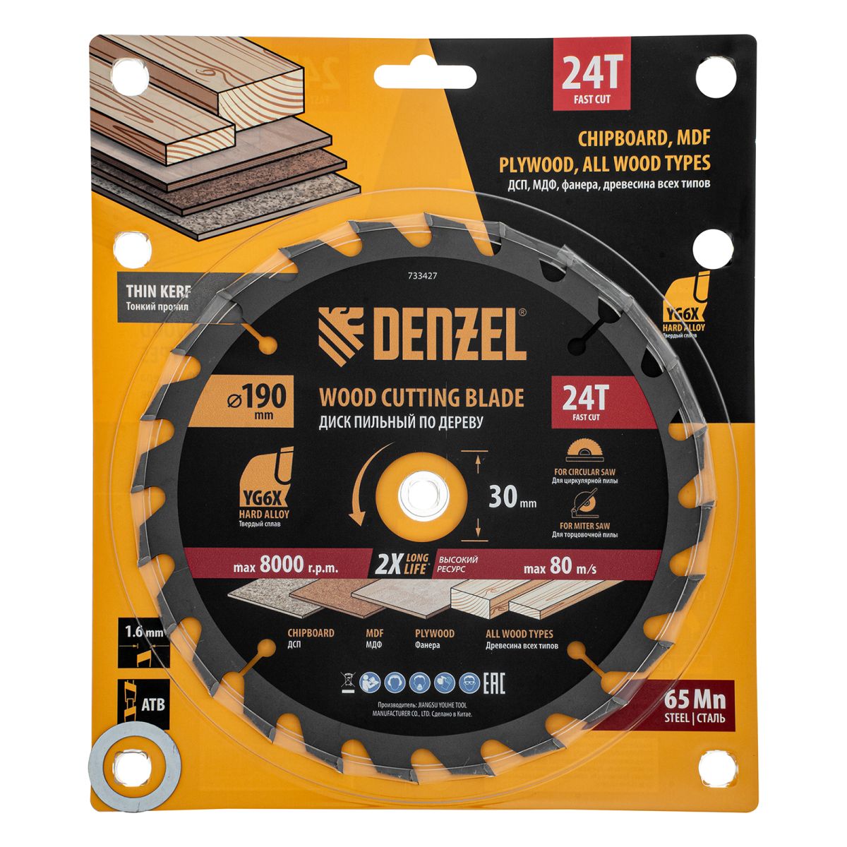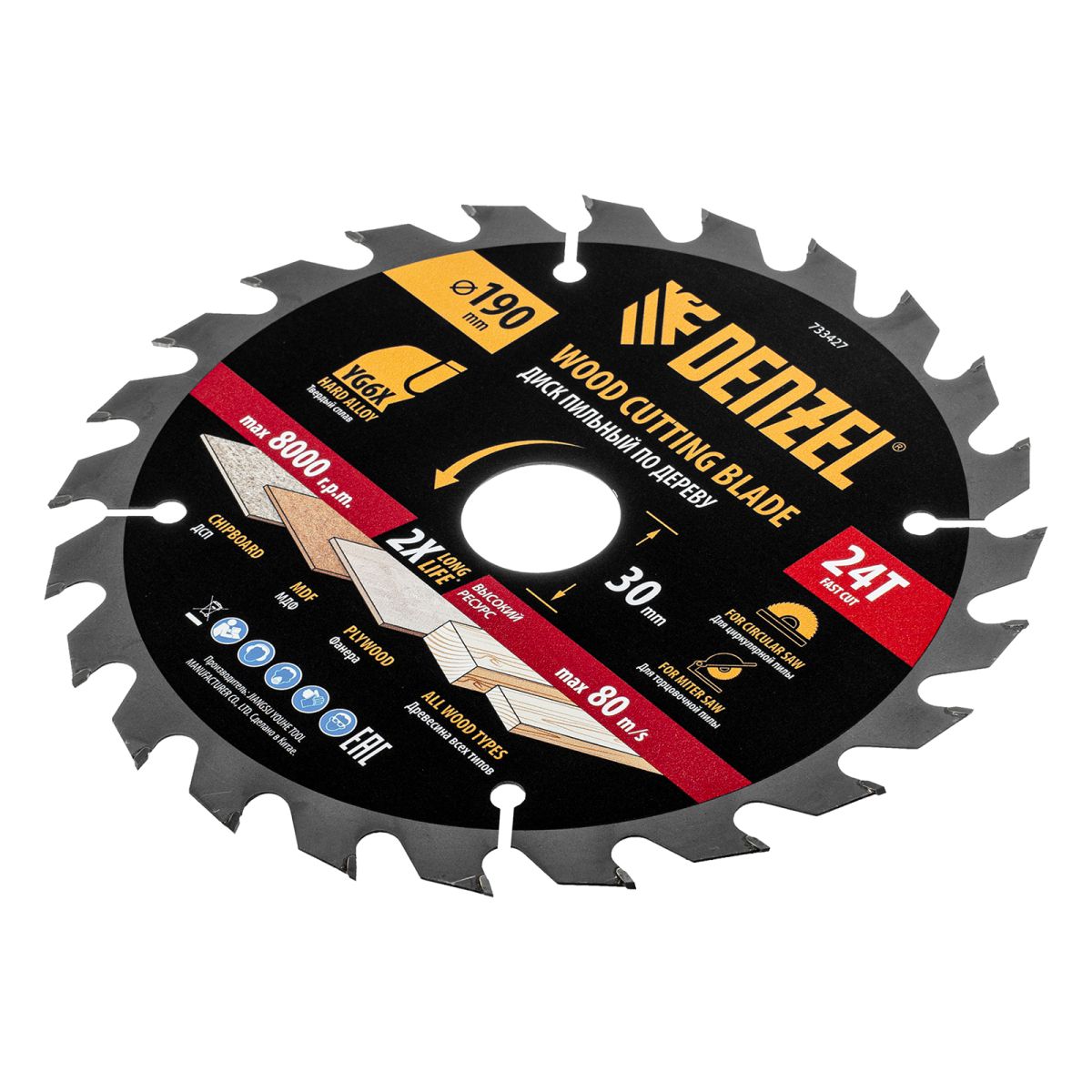 Тонкий пильный диск Denzel 733427 диаметром 190 x 30 мм, с 24 зубьями, устанавливается на циркулярную, торцовочную пилу или распиловочный станок и предназначен для выполнения работ по дереву. Подходит для быстрого реза древесины любого типа, а также фанеры, ДСП, МДФ. Крупные зубья типа ATB обеспечивают высокую скорость как продольного, так и поперечного распила. Толщина диска уменьшена, что повышает производительность и снижает нагрузку на инструмент. На зубья напаяны твердосплавные пластины, длительное время сохраняющие режущую способность. Пластины из твердого сплава YG6X прошли многоступенчатую заточку, что позволило достичь оптимальной геометрии и максимальной эффективности распиловки.