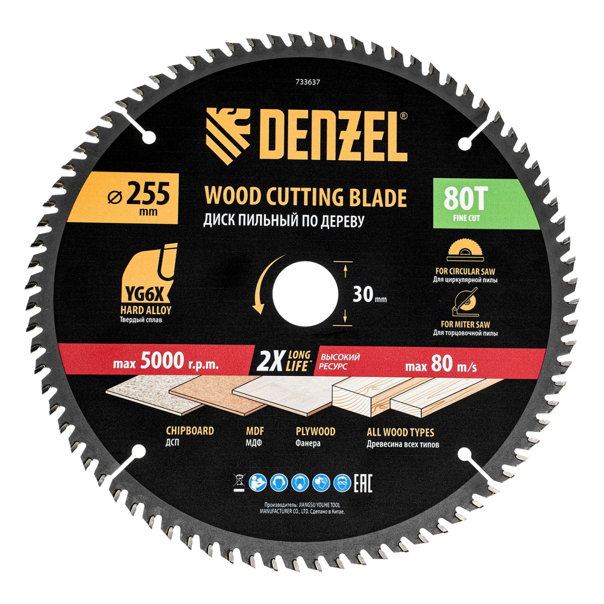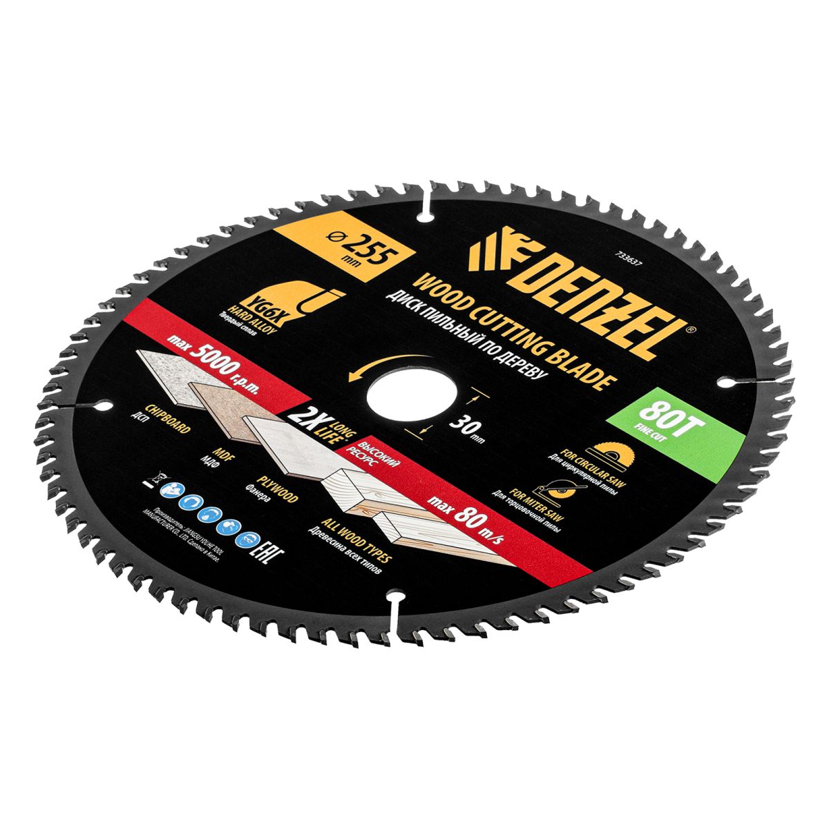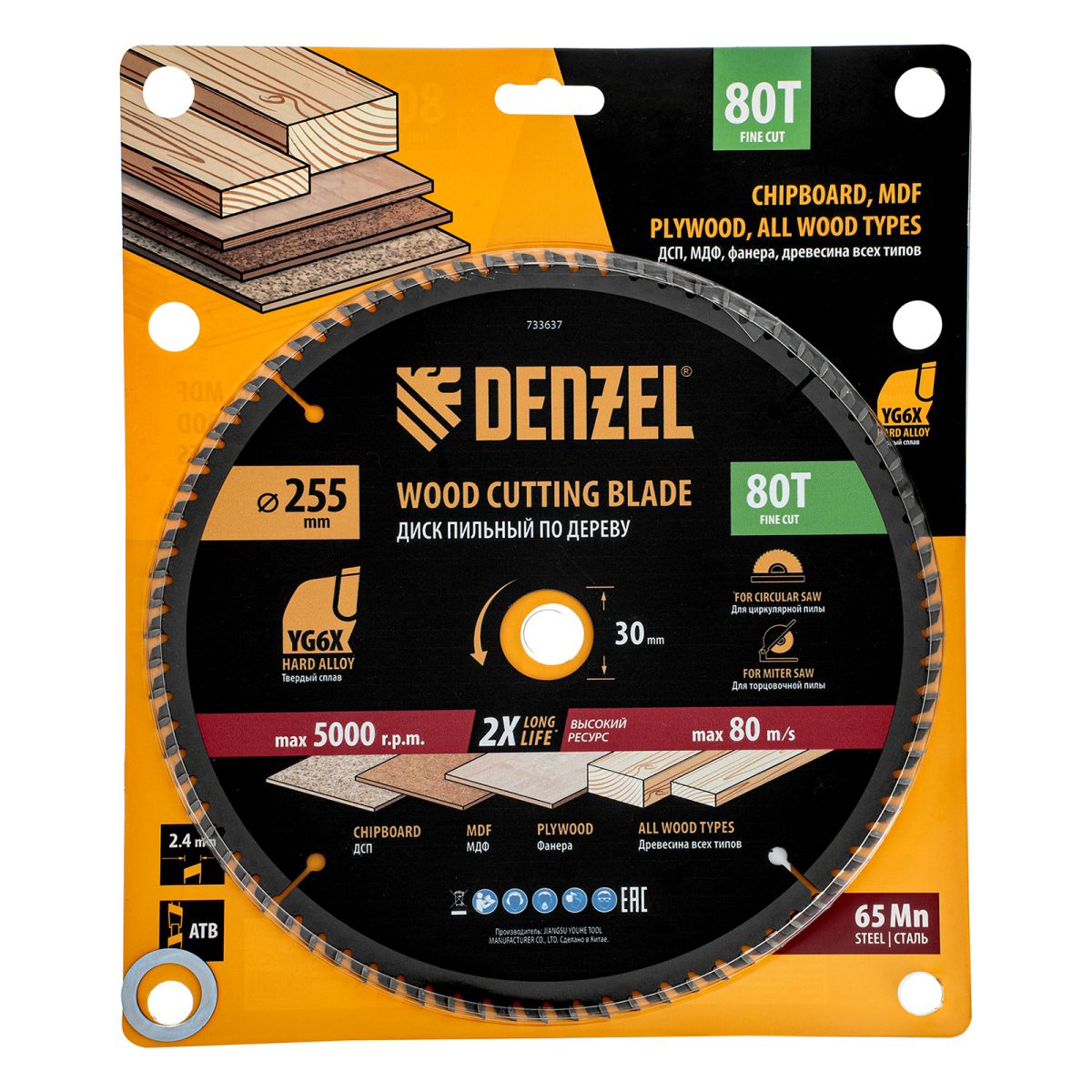 Пильный диск Denzel 733637 диаметром 255 x 30 мм, с 80 зубьями, предназначен для точного продольного и поперечного распила твердой и мягкой древесины, фанеры, МДФ, ДСП. 80 зубьев типа ATB с режущими пластинами оптимальной геометрии обеспечивают максимально чистый рез. Режущие пластины из твердого сплава YG6X сохраняют рабочие свойства при интенсивном использовании. Диск устанавливается на циркулярную, торцовочную пилу или на распиловочный станок. В комплект поставки входит переходное кольцо с 30 на 20 мм, что позволяет изменить посадочный размер и расширяет возможности использования диска.