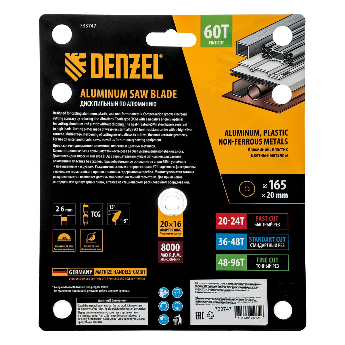 Пильный диск Denzel 733747 диаметром 165 x 20 мм, с 60 зубьями, предназначен для распиливания заготовок из алюминия, пластика, цветных металлов. Устанавливается на циркулярную или торцовочную пилу, поддерживающую максимальную частоту вращения 12000 об/мин, также возможно использование с распиловочным станком. Зубья трапециевидно-плоского типа (TCG) с отрицательным углом заточки обеспечивают ровный рез без сколов. В комплект поставки входит переходное кольцо 20/16 мм, позволяющее изменить посадочный диаметр при необходимости.