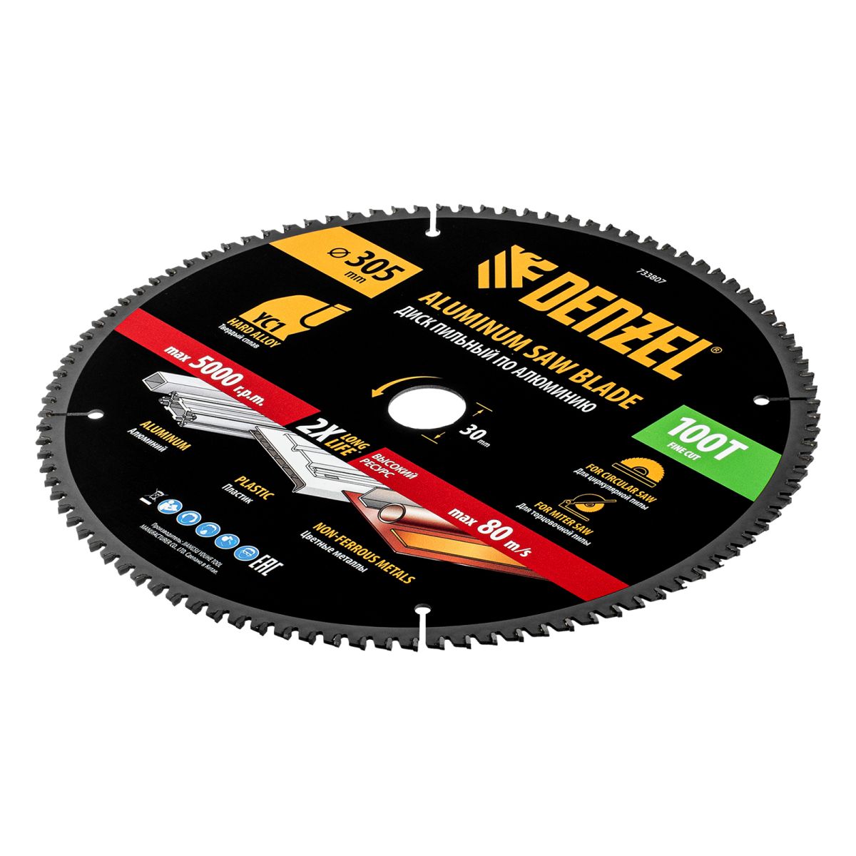 Пильный диск Denzel 733807 диаметром 305 x 30 мм, с 100 зубьями, предназначен для точного распиливания заготовок из алюминия, пластика, цветных металлов. Устанавливается на циркулярную или торцовочную пилу, также возможно использование с распиловочным станком. Зубья трапециевидно-плоского типа (TCG) с отрицательным углом заточки обеспечивают ровный рез без сколов. В комплект поставки входит переходное кольцо 30/20 мм, позволяющее изменить посадочный диаметр при необходимости.