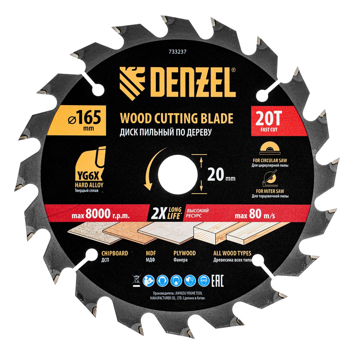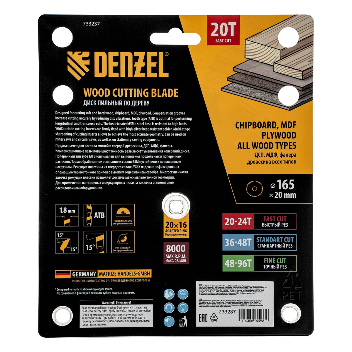 Пильный диск Denzel 733237 диаметром 165 x 20 мм, с 20 зубьями, предназначен для продольного и поперечного распила твердой и мягкой древесины, фанеры, МДФ, ДСП. 20 зубьев типа ATB с режущими пластинами оптимальной геометрии обеспечивают быстрый рез. Режущие пластины из твердого сплава YG6X сохраняют рабочие свойства при интенсивном использовании. Диск устанавливается на циркулярную, торцовочную пилу или на распиловочный станок. В комплект поставки входит переходное кольцо с 20 на 16 мм, что позволяет изменить посадочный размер и расширяет возможности использования диска.