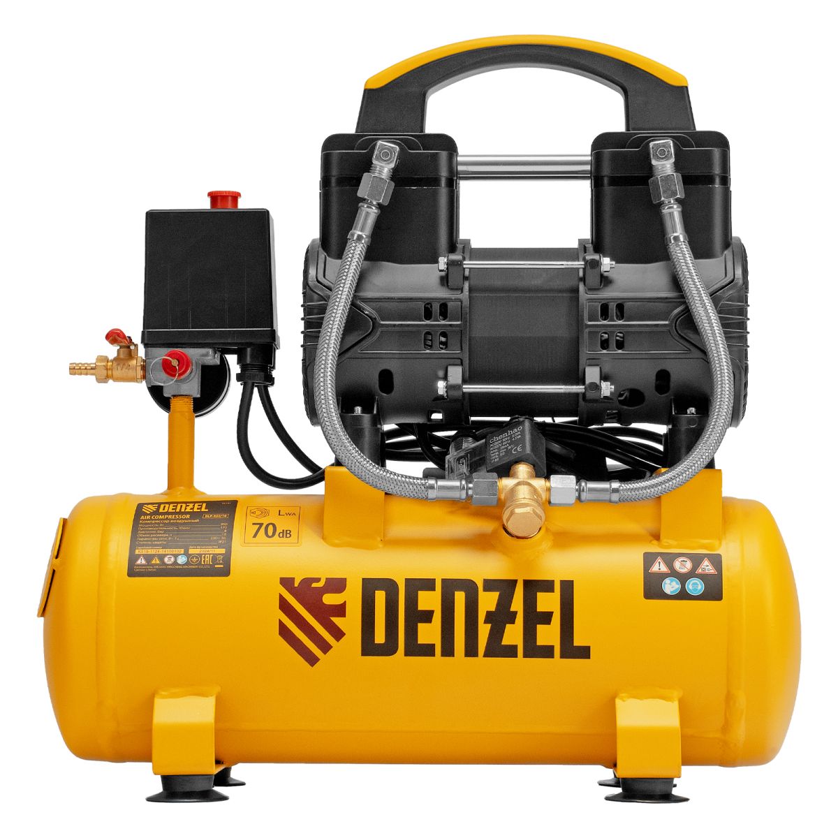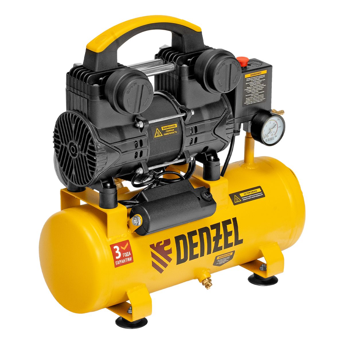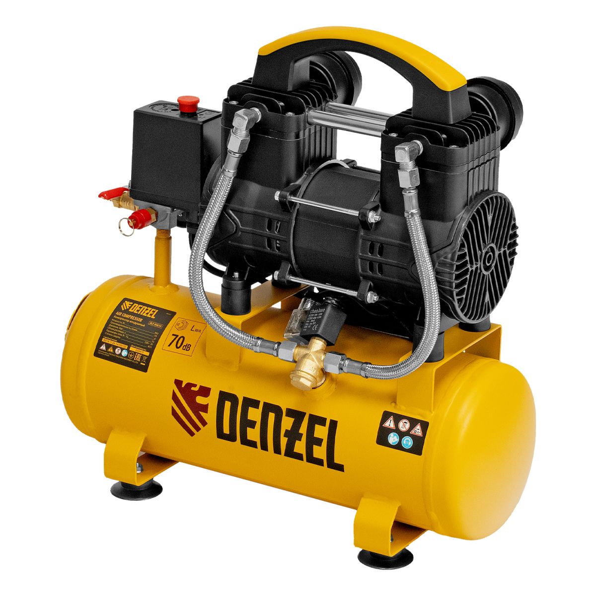 Безмасляный малошумный компрессор Denzel DLP-950/10 58141 мощностью 950 Вт и производительностью 170 л/мин, с ресивером объемом 10 л, оснащен двигателем со скоростью вращения 2850 об/мин. Предназначен для обеспечения пневмоинструмента сжатым воздухом. Для работы компрессора не требуется масло, поэтому он подходит для проведения покрасочных работ и продувки электронных компонентов. Прямой привод обеспечивает максимально эффективную работу и высокую производительность. Благодаря низкому уровню шума эксплуатация компрессора не вызывает ощущение дискомфорта. Для подключения шланга пневмомагистрали или пневматического инструмента используется штуцер елка.
