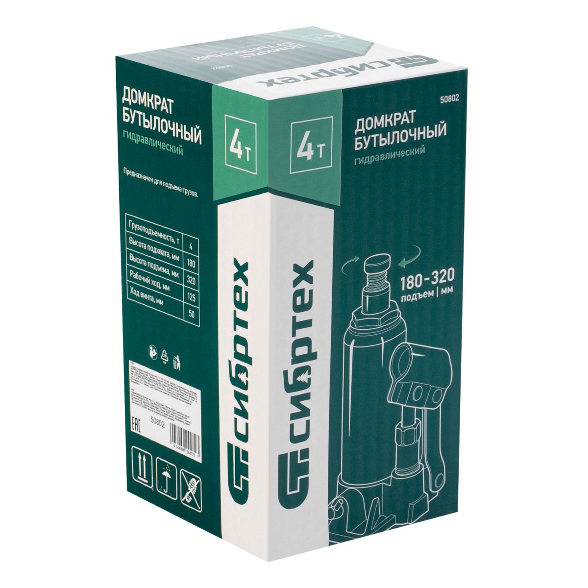 Домкрат гидравлический бутылочный Сибртех 50802 предназначен для подъема грузов массой до 4 т на высоту от 180 до 320 мм. Не требует больших усилий от пользователя и значительно облегчает рабочий процесс. Домкрат будет полезен при проведении техобслуживания машины в автосервисе или гараже.