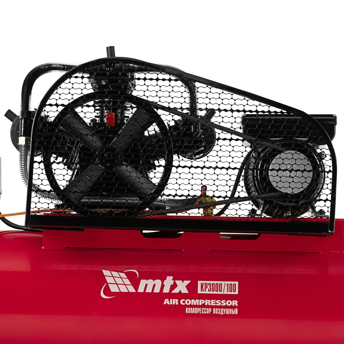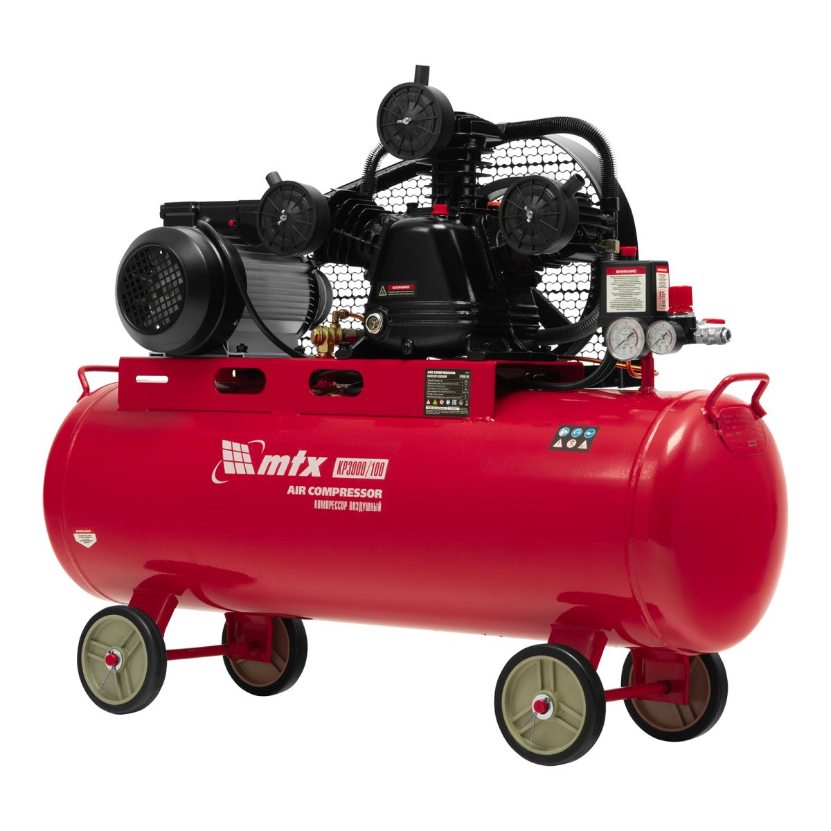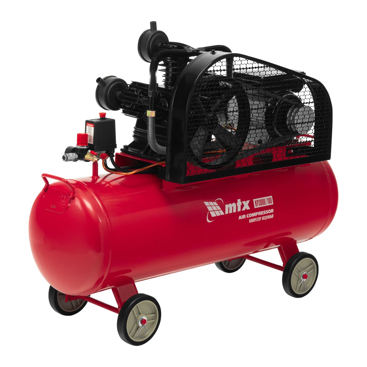 Компрессор воздушный МТХ КР3000/100 58023 с ременным приводом от электродвигателя, мощностью 3,0 кВт и производительностью 510 л/мин, с ресивером объемом 100 литров, применяется для подачи сжатого атмосферного воздуха к пневматическому инструменту. К нему можно подключить гайковерт, дрель, углошлифовальную машину, степлер, краскопульт, продувочный пистолет или другой пневмоинструмент. Для подключения предусмотрены 2 штуцера: быстросъемный и «елочка». Компрессор подходит для профессионального использования на предприятии автосервиса, строительной площадке, в мастерской.