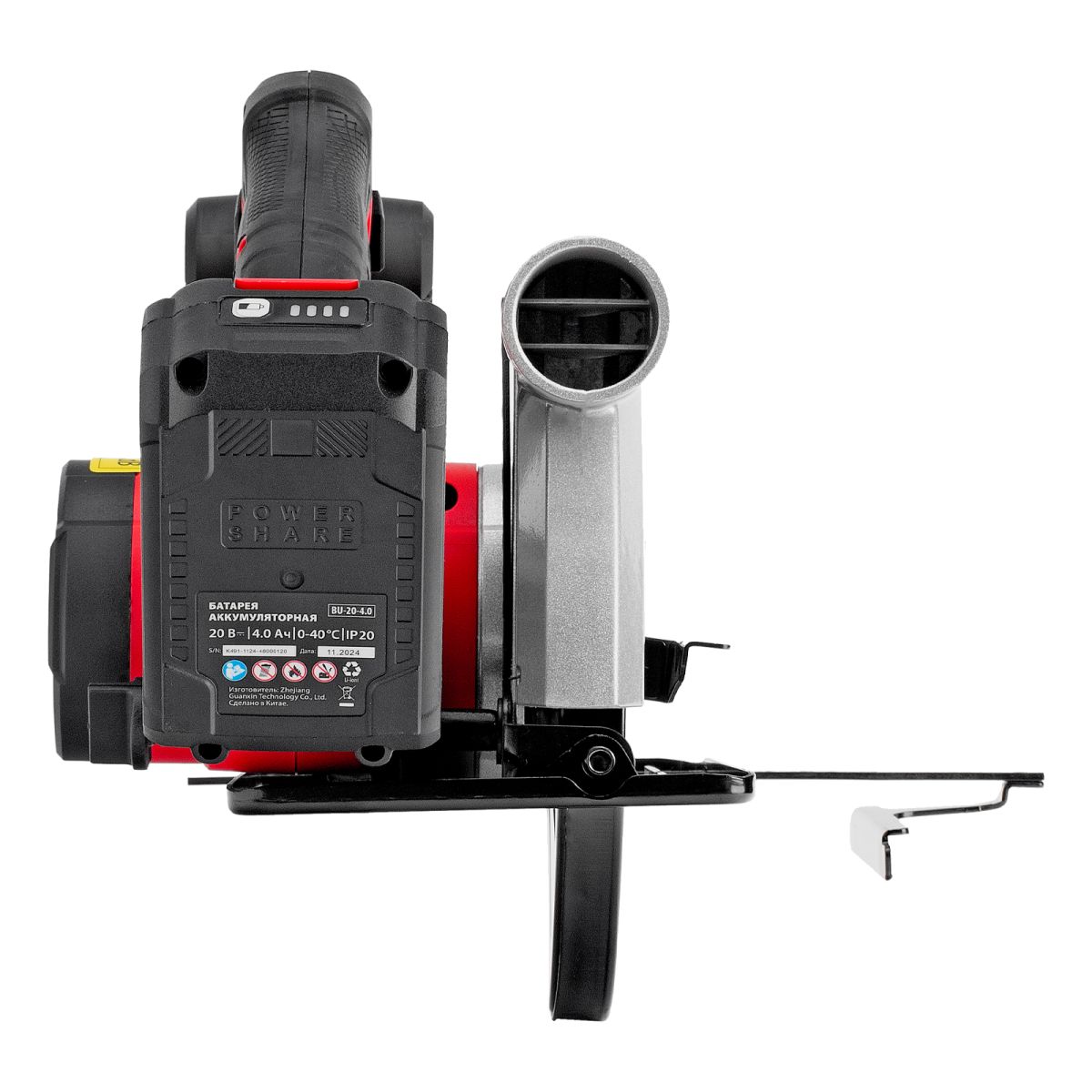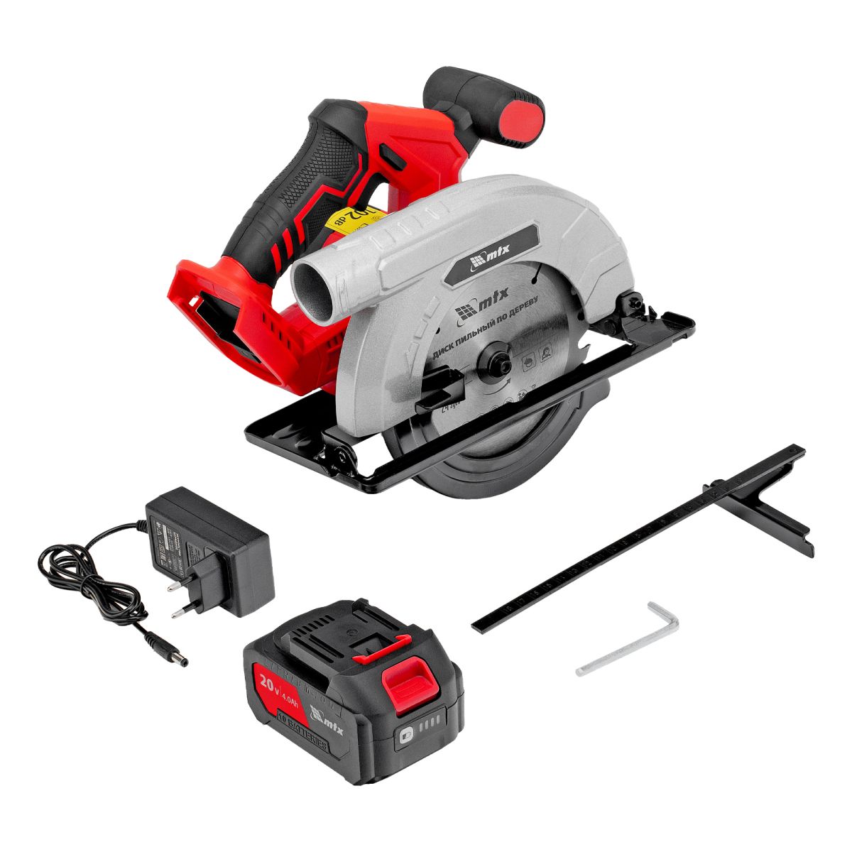 Пила циркулярная аккумуляторная - 1 штПильный диск по дереву - 1 штКлюч для снятия диска - 1 штБатарея аккумуляторная - 1 штЗарядное устройство - 1 штПараллельная направляющая - 1 штРуководство по эксплуатации с гарантийным талоном - 1 шт