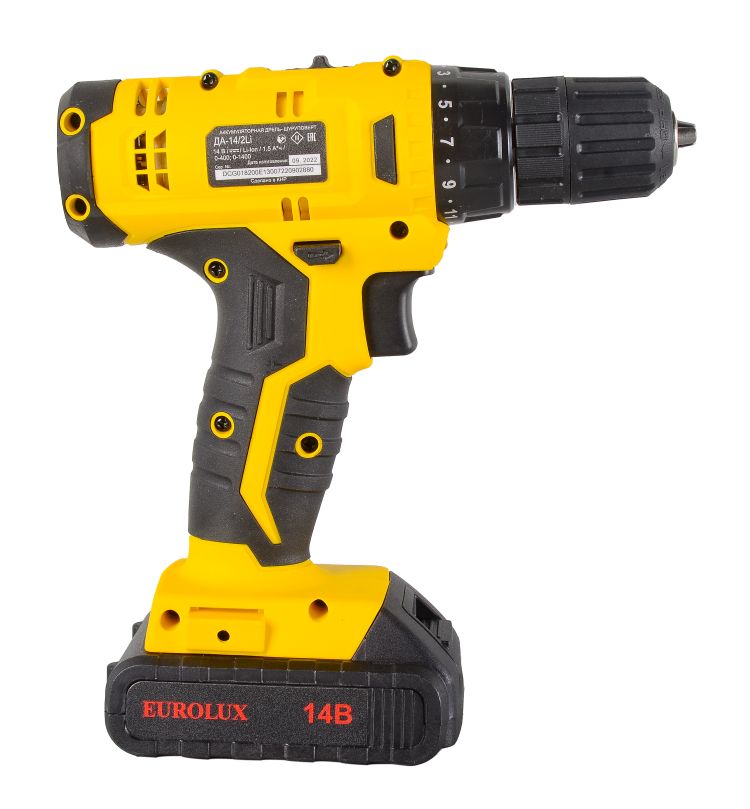 Аккумуляторная дрель-шуруповерт Eurolux ДА-14/2Li – ручной электроинструмент с регулируемым крутящим моментом, предназначенный для закручивания и откручивания шурупов, саморезов, винтов и других видов крепежных изделий, а также сверления отверстий в различных конструкционных материалах.