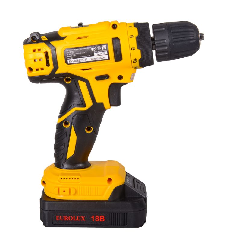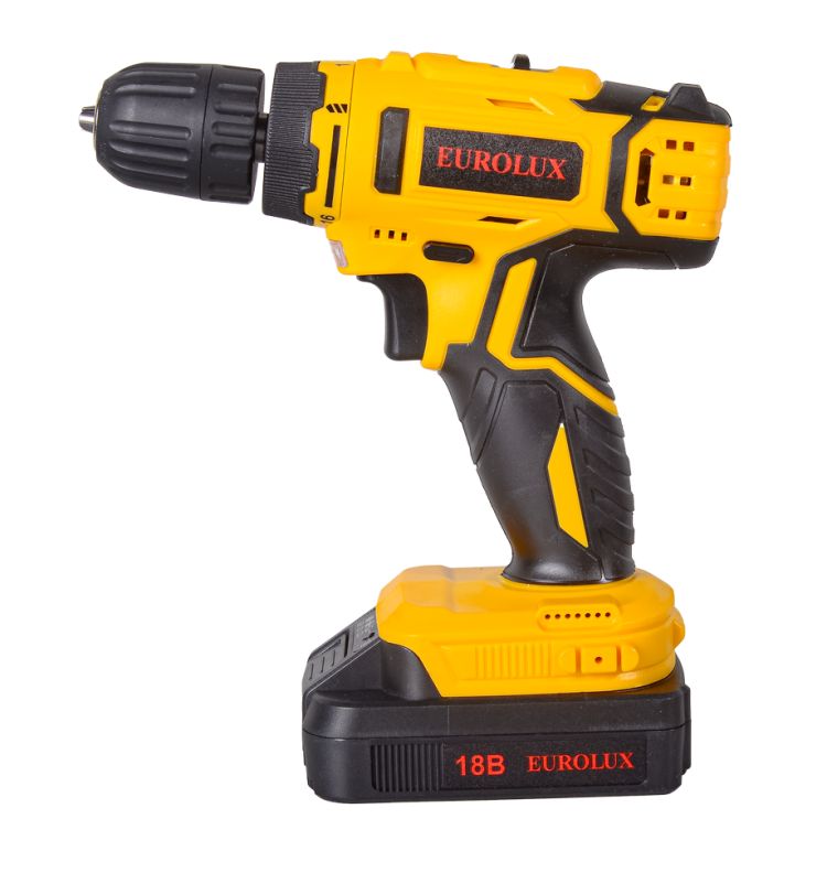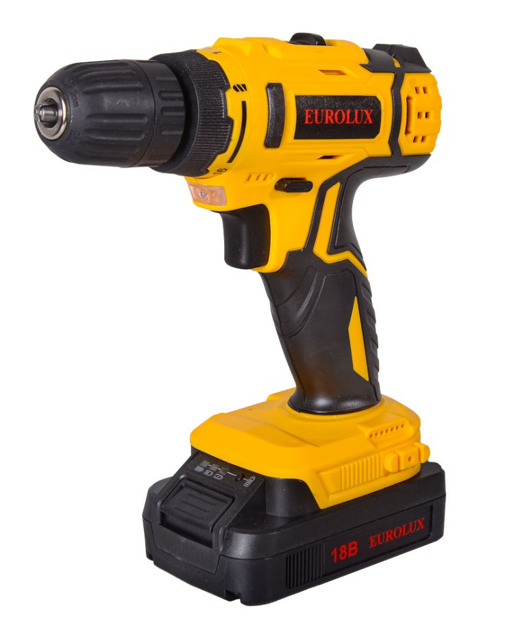 Аккумуляторная дрель-шуруповерт Eurolux ДА-18/2Li – ручной электроинструмент с регулируемым крутящим моментом, предназначенный для закручивания и откручивания шурупов, саморезов, винтов и других видов крепежных изделий, а также сверления отверстий в различных конструкционных материалах.