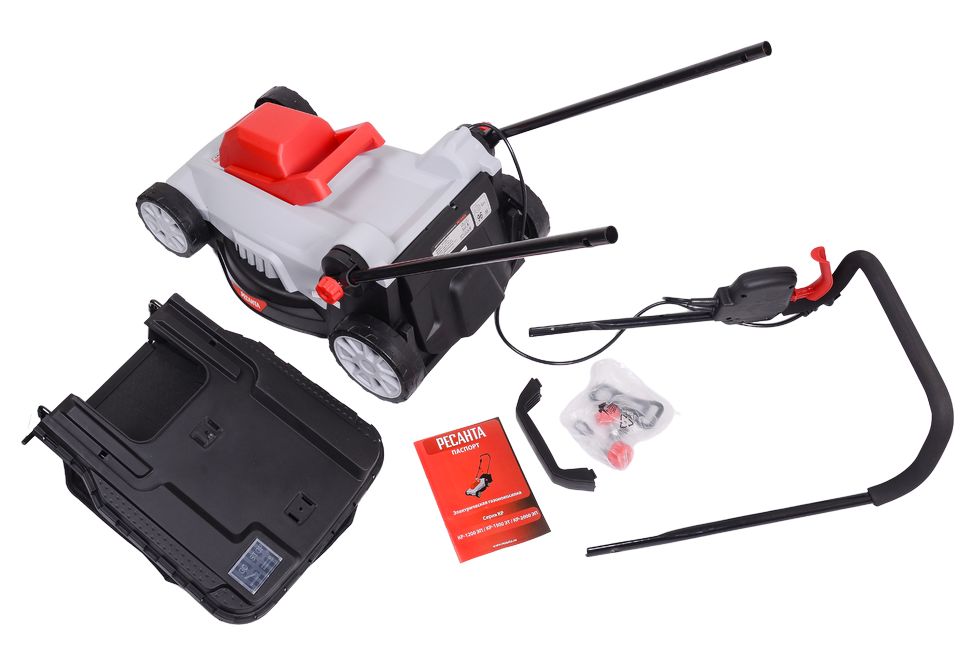 Паспорт изделия, Сборная рукоятка, в комплекте с фурнитурой, Травосборник, Комплект колёс (на некоторых моделях уже установлены)