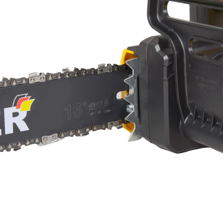 - Безопасность. Автоматический тормоз цепи в виде щитка обеспечивает безопасность работы с электропилой, в первую очередь, защиту ваших рук.