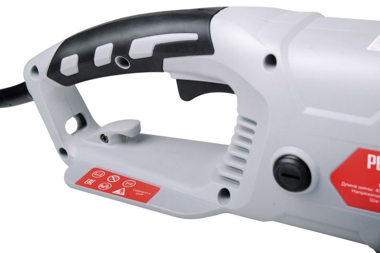 - Надежное удержание. Удобная задняя рукоятка небольшого размера с пусковым курком жестко сидит в руке, что способствует надежному удержанию электропилы.