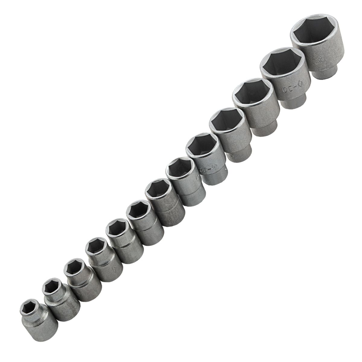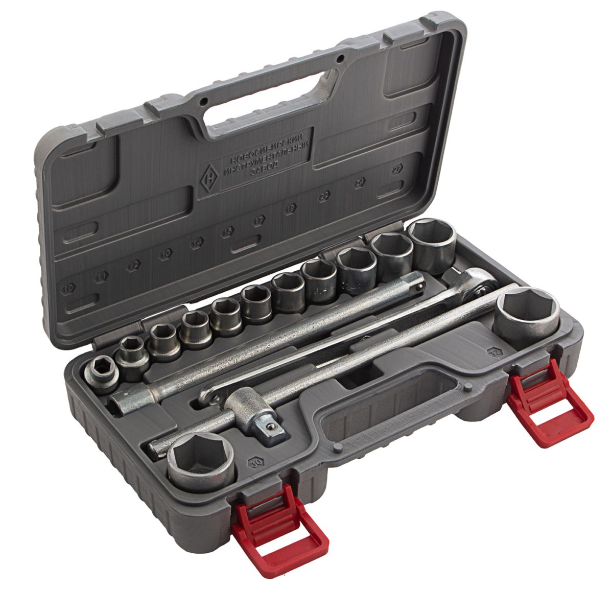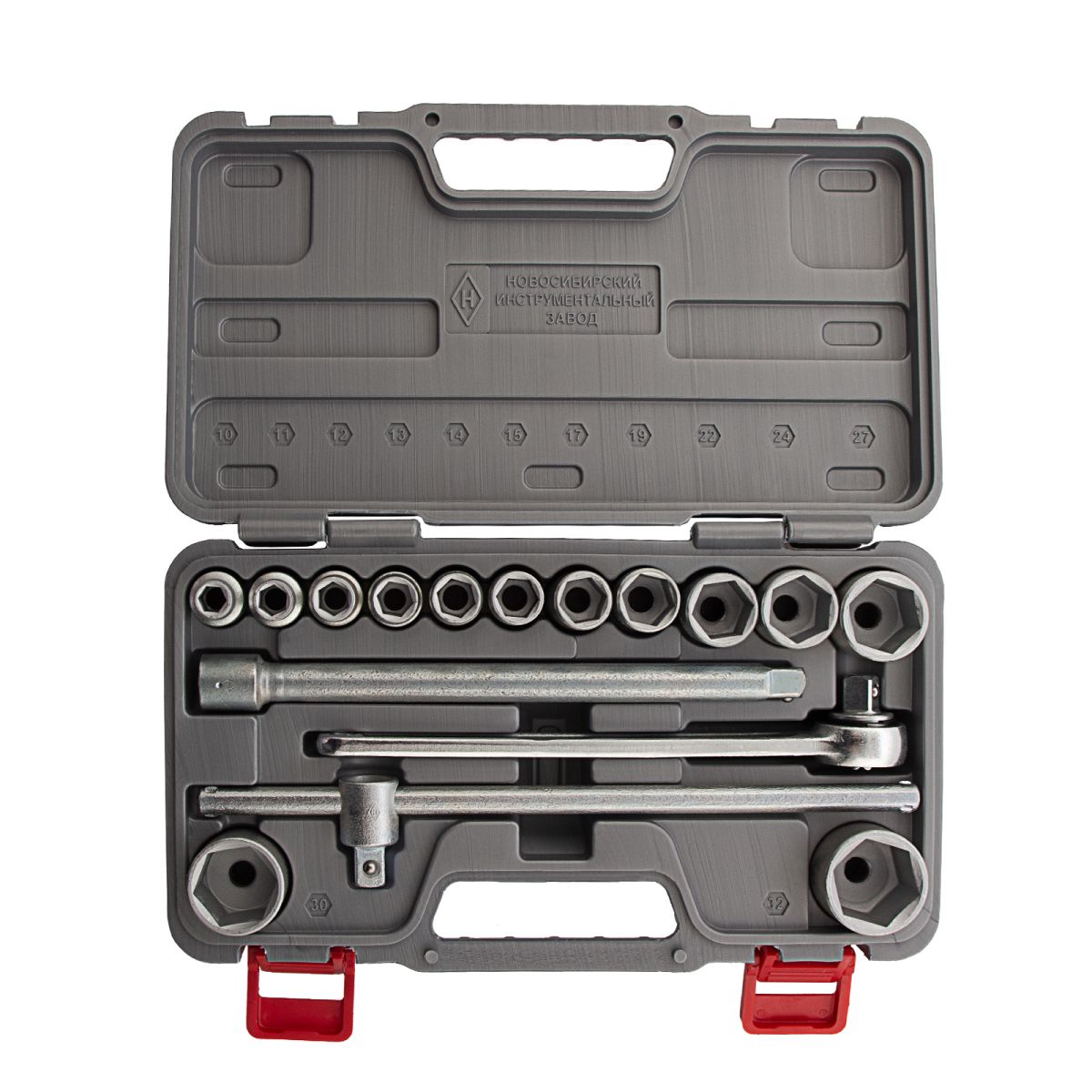 Головки 10, 11, 12, 13, 14, 15, 17, 19, 22, 24, 27, 30, 32 - 13 штКлюч трещотка - 1 штВороток Т-образный - 1 штУдлинитель - 1 штКейс - 1 штТрещотка - 1 шт