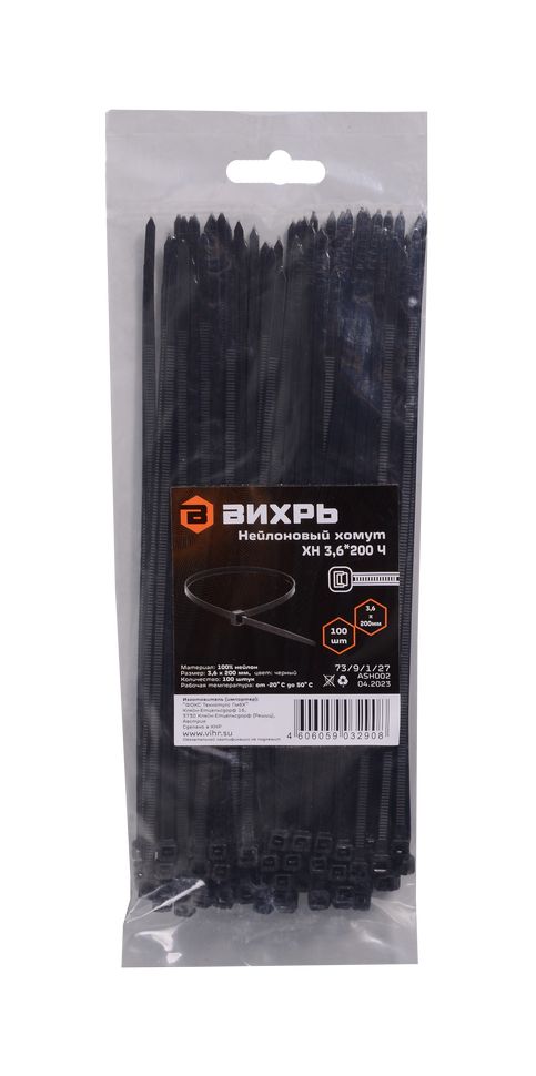 Хомуты нейлоновые (стяжки) черные 100 шт. Вихрь 3,6*200 Ч