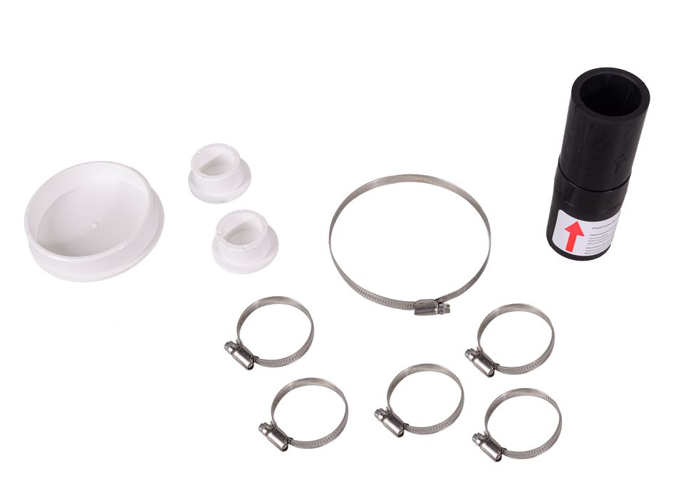 Паспорт изделия, Выходной патрубок с обратным клапаном, Выходная муфта, Хомут металлический, Резиновая муфта переходник для туалета, Заглушки для туалета