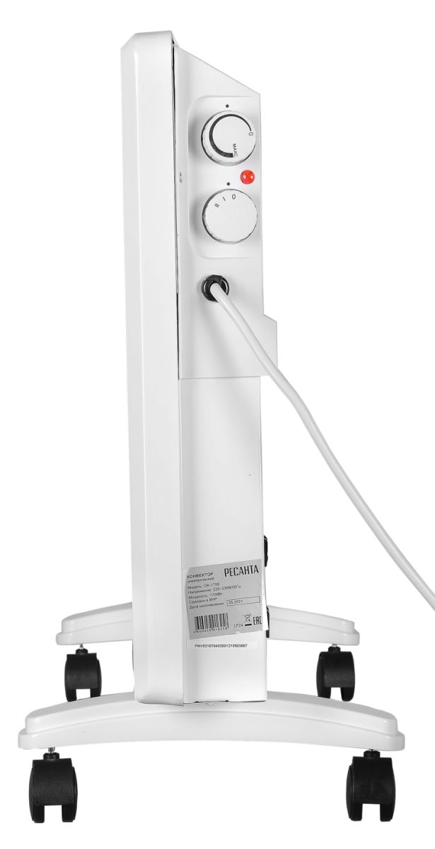 онвектор РЕСАНТА ОК-1700 для обогрева помещений. Состоит из нагревательной части (ТЭН), заключенной в нижней части корпуса со щелеобразными отверстиями снизу и жалюзи в верхней части. Данная конструкция даёт возможность воздуху беспрепятственно проходить внутри конвектора,