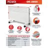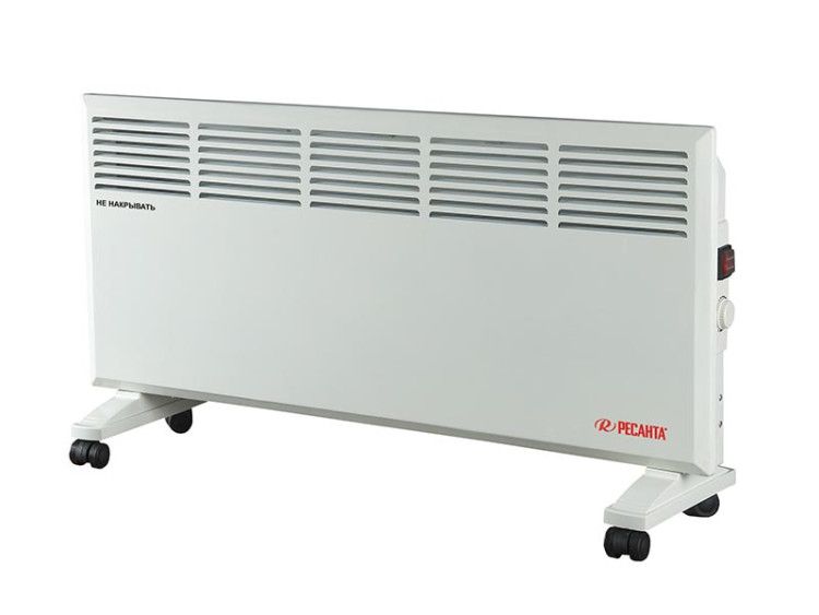 Электрический конвектор РЕСАНТА ОК-2500 для обогрева помещений. Состоит из нагревательной части (ТЭН), заключенной в нижней части корпуса со щелеобразными отверстиями снизу и жалюзи в верхней части. Данная конструкция даёт возможность воздуху беспрепятственно проходить внутри конвектора,