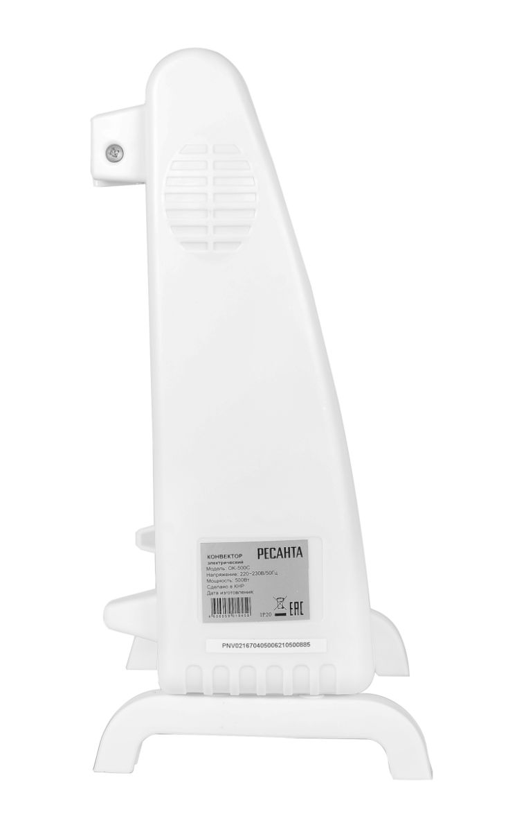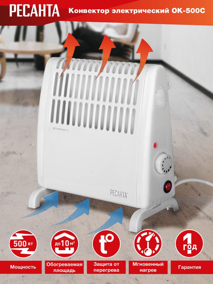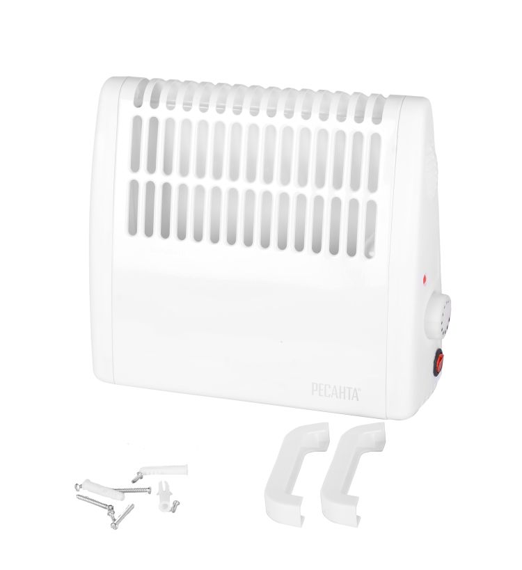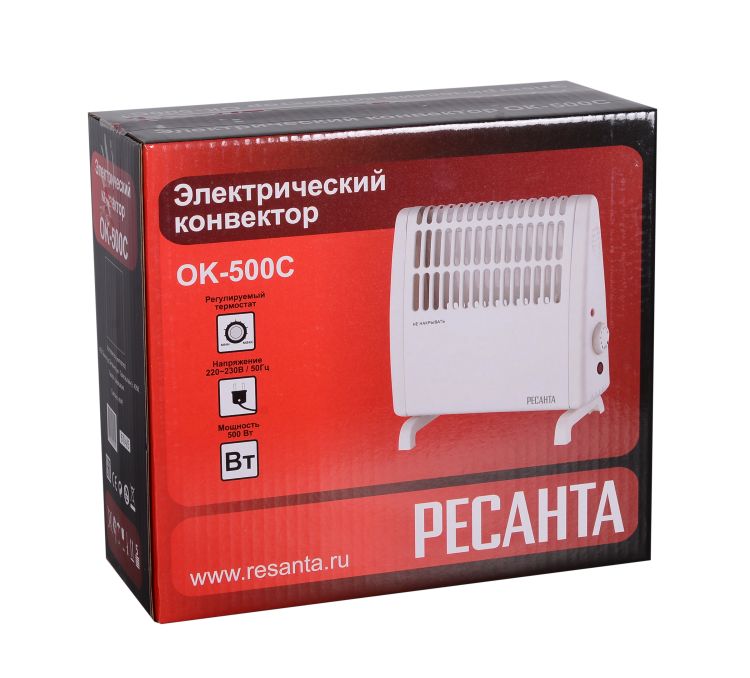 Электрический конвектор РЕСАНТА ОК-500С для обогрева помещений. Состоит из нагревательной части (СТИЧ), заключенной в нижней части корпуса со щелеобразными отверстиями снизу и жалюзи в верхней части. Данная конструкция даёт возможность воздуху беспрепятственно проходить внутри конвектора,