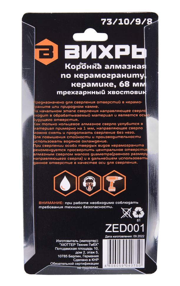 Коронка алмазная Вихрь по керамограниту/керамике, 68 мм