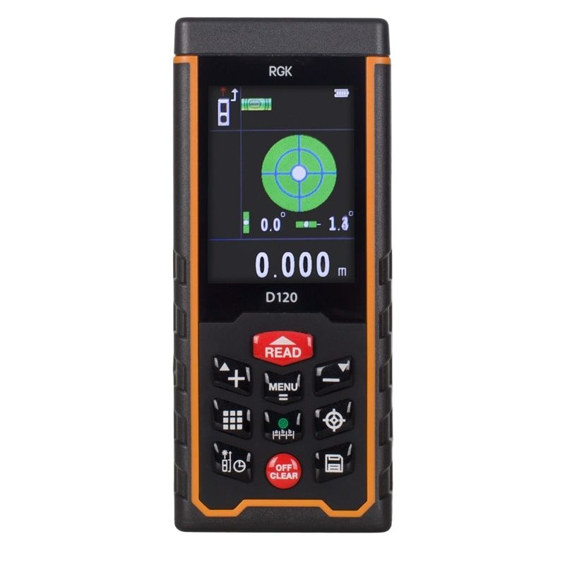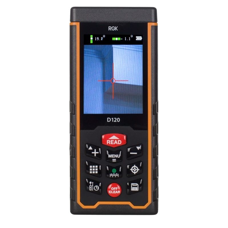 Дистанция измерений RGK D120 составляет 120 метров при точности ±3 мм. При этом дальномер легко приводит измерения в горизонт с помощью встроенного цифрового уровня и режима непрерывных измерений.