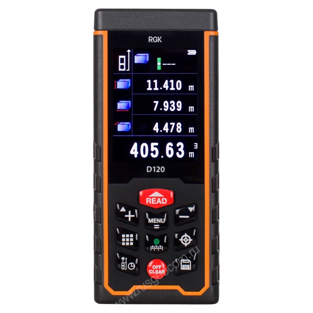 Являясь флагманом линейки дальномеров этого бренда, лазерная рулетка с видоискателем RGK D120 (с поверкой) оснащена всеми стандартными функциями: