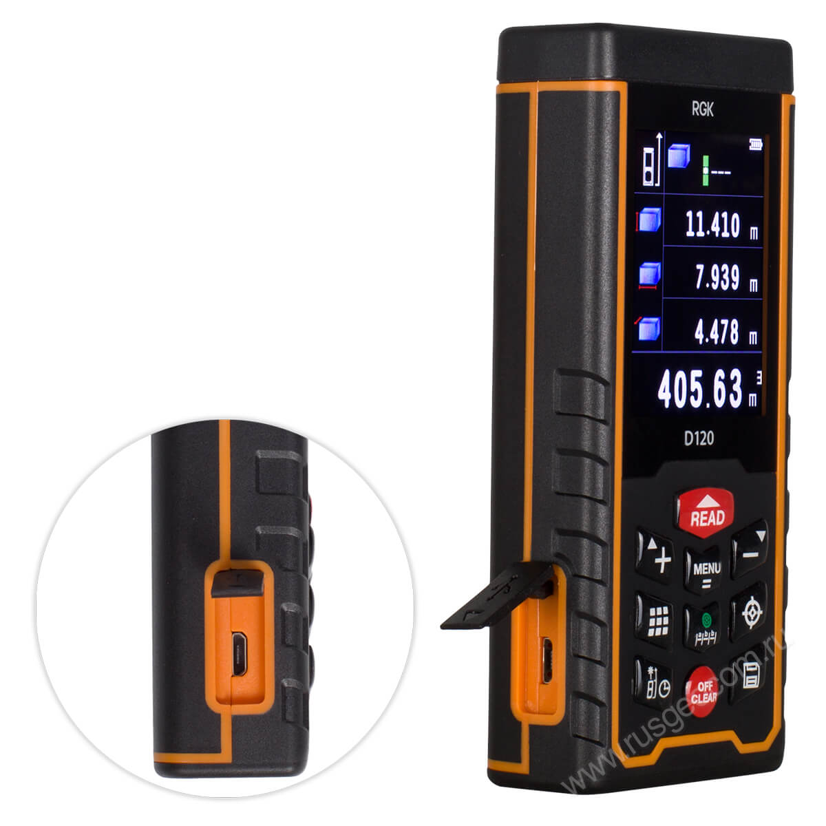 - Micro-USB — служит для загрузки сохранённых данных на ПК для последующей обработки в программе LDM Studio, поставляемой в комплекте с RGK D120 (с поверкой). С помощью этой программы вы сможете мгновенно распечатать результаты измерений или выгрузить их в таблицу Excel. В таблице содержится информация обо всех замерах и результатах вычислений, а также о промежуточных значениях при подсчёте площадей и объёмов.