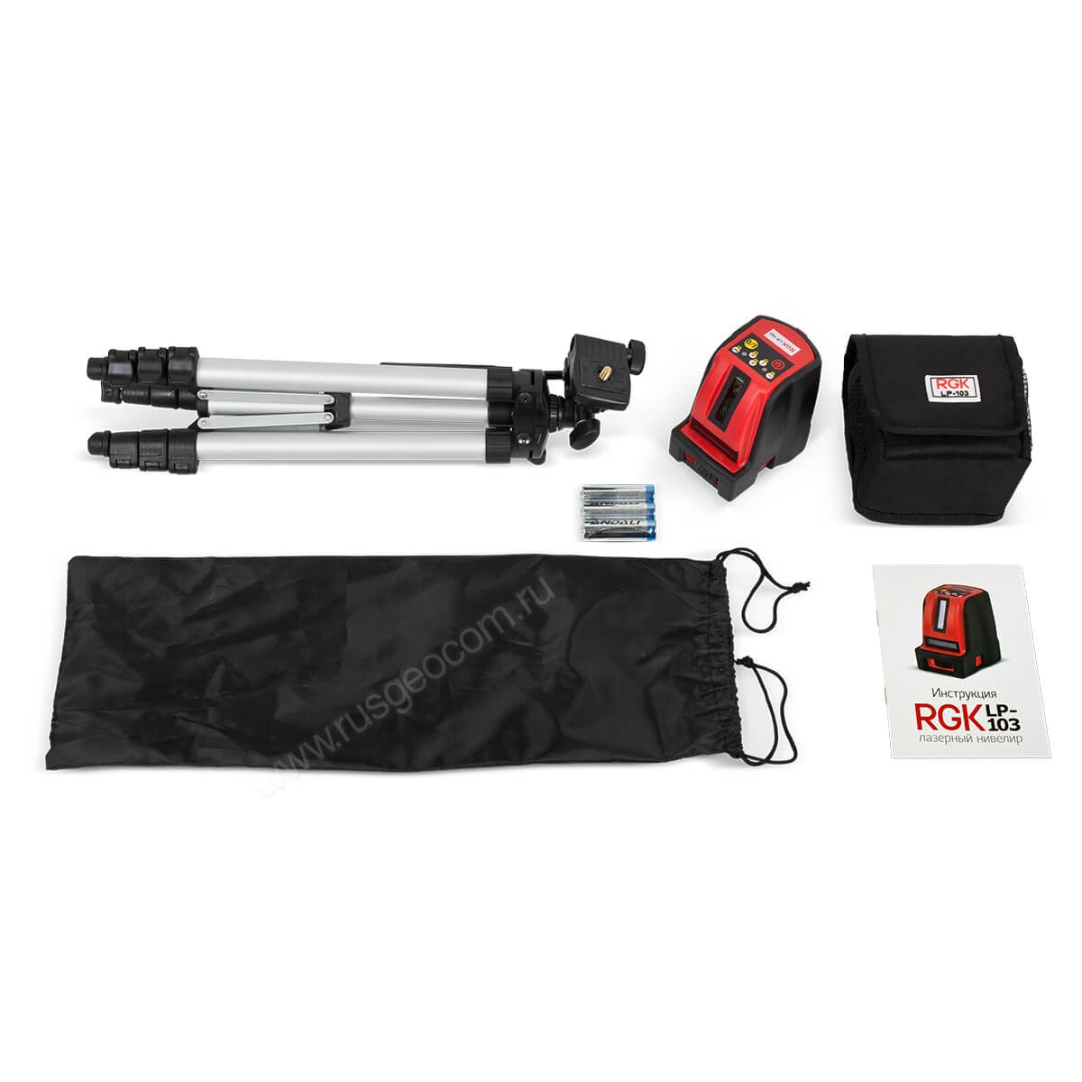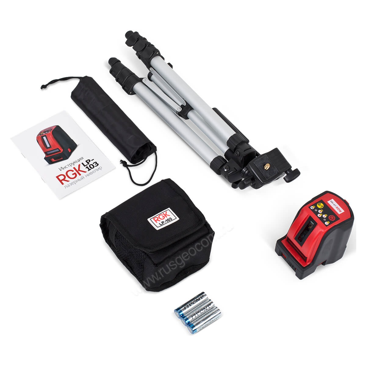 Стандартный комплект: Лазерный нивелир LP-103, штатив, футляр, элементы питания, инструкция на русском языке.