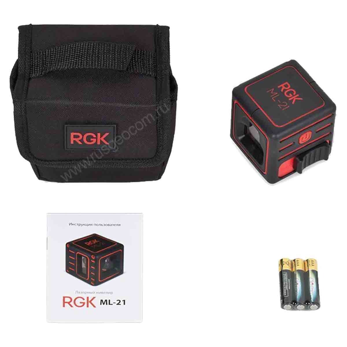 Корпус покрыт мягким прорезиненным пластиком, предохраняющим уровень RGK ML-21 от случайных ударов и падений с высоты до 1 метра. Питание осуществляется тремя батареями типа ААА, батарейный отсек находится на задней стороне прибора. Непрерывное время работы достигает 8 часов.
