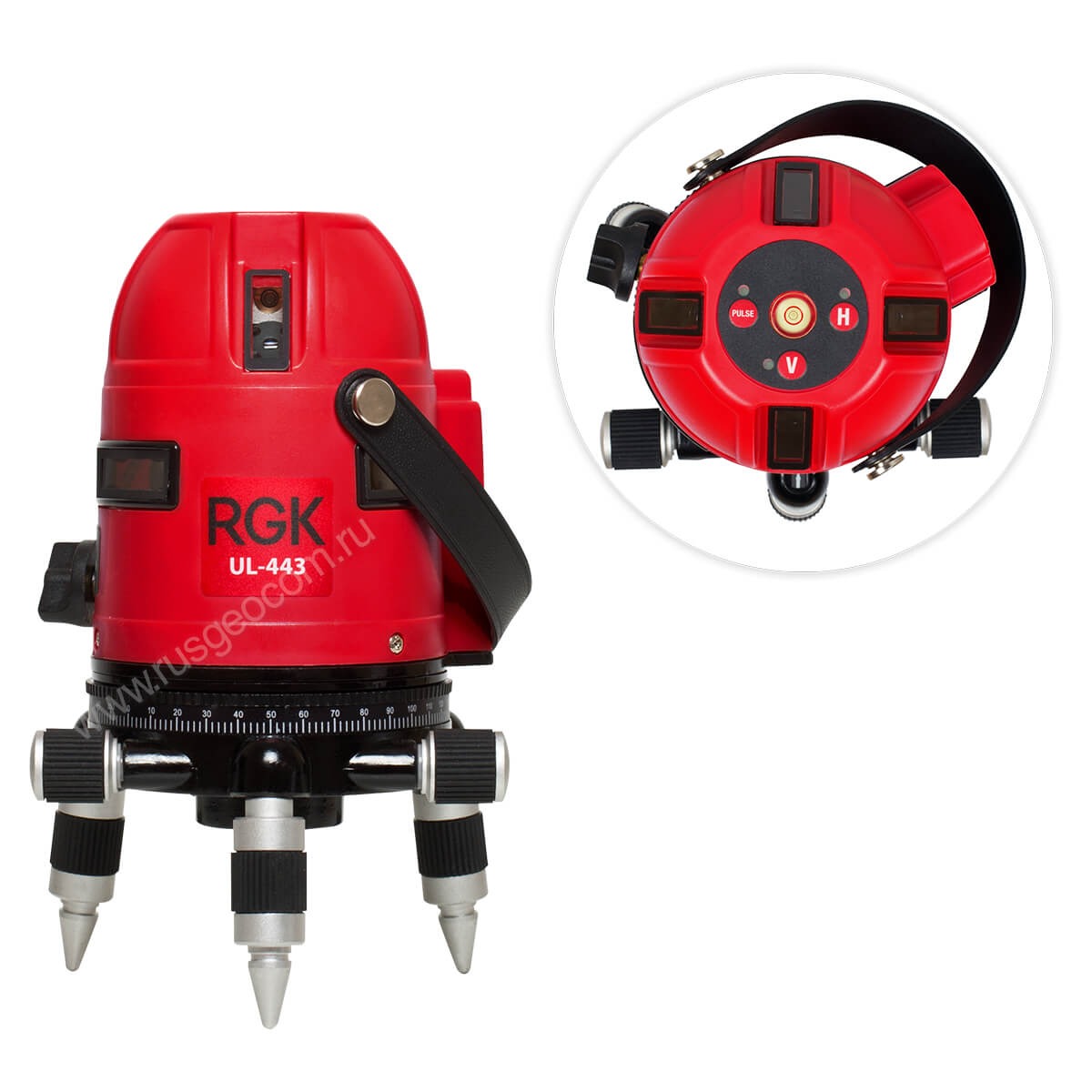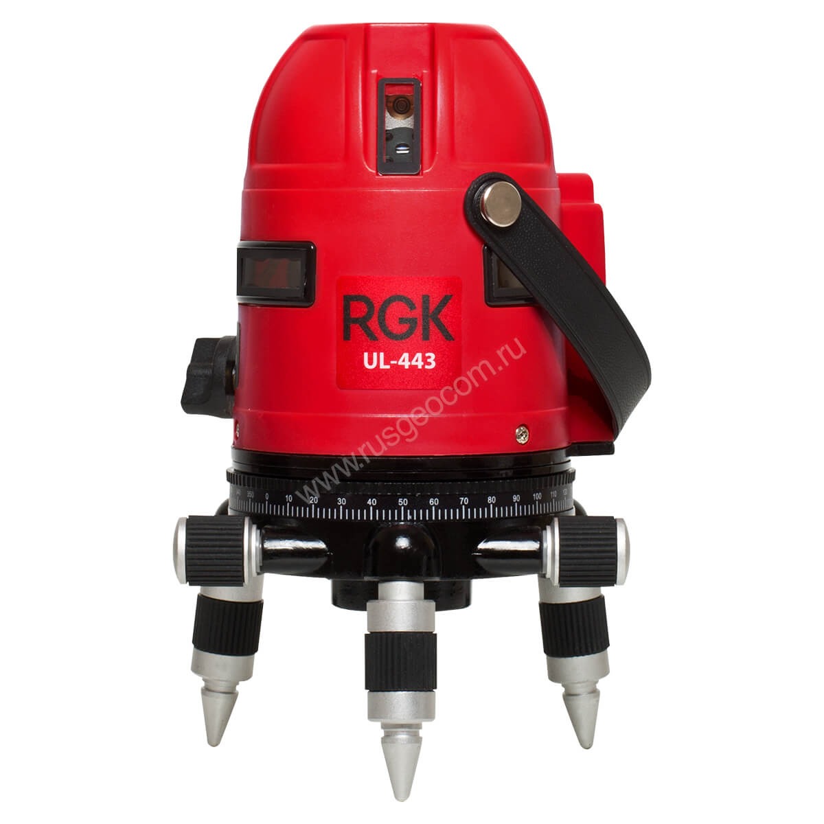 Корпус RGK UL-443 выполнен из качественных материалов и обеспечивает надёжную защиту прибора от строительной пыли и влажности. Питание прибора осуществляется от стандартных батареек типа АА. Прибор поставляется в ударопрочном кейсе.