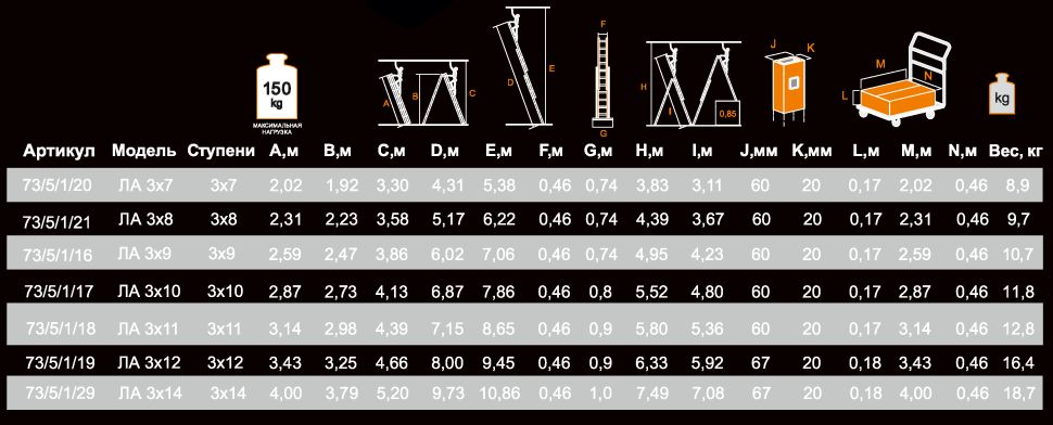 10.7 кг, секций: 3, ступеней: 8, макс. нагрузка: 150 кг, длина: 5.10 м
