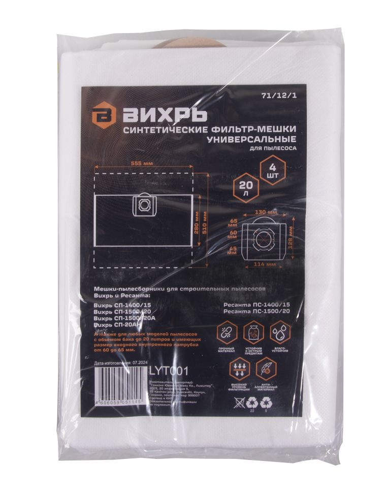 Мешки для строительного пылесоса Вихрь синтетические 20 л, 4 шт
