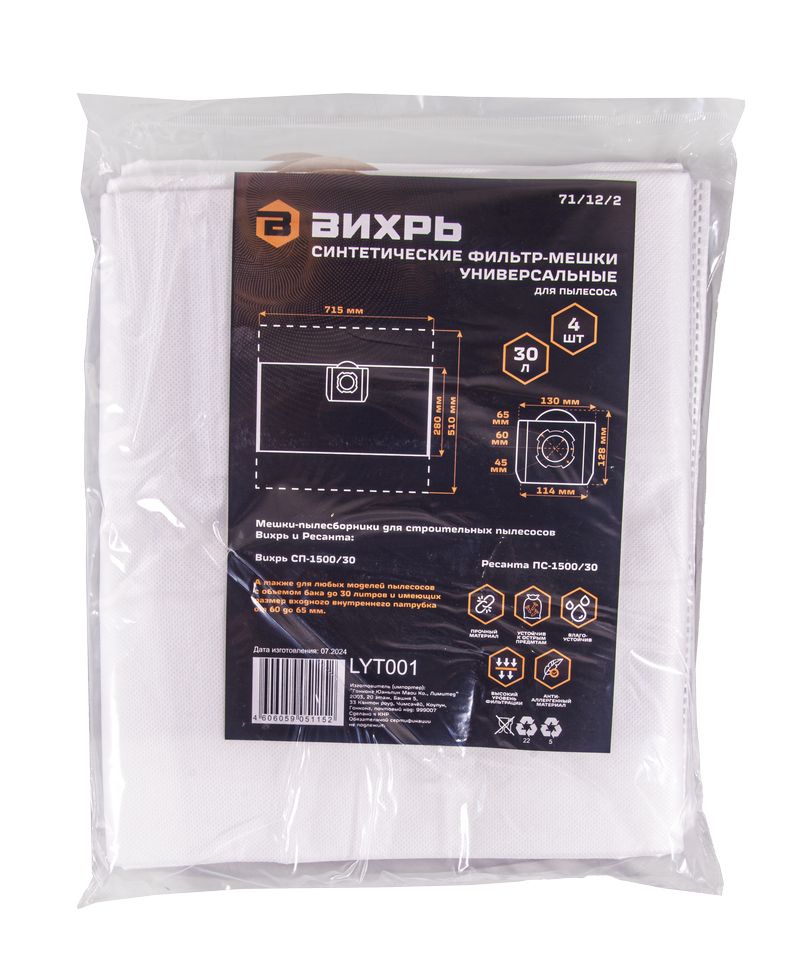 Мешки для строительного пылесоса Вихрь синтетические 30 л, 4 шт
