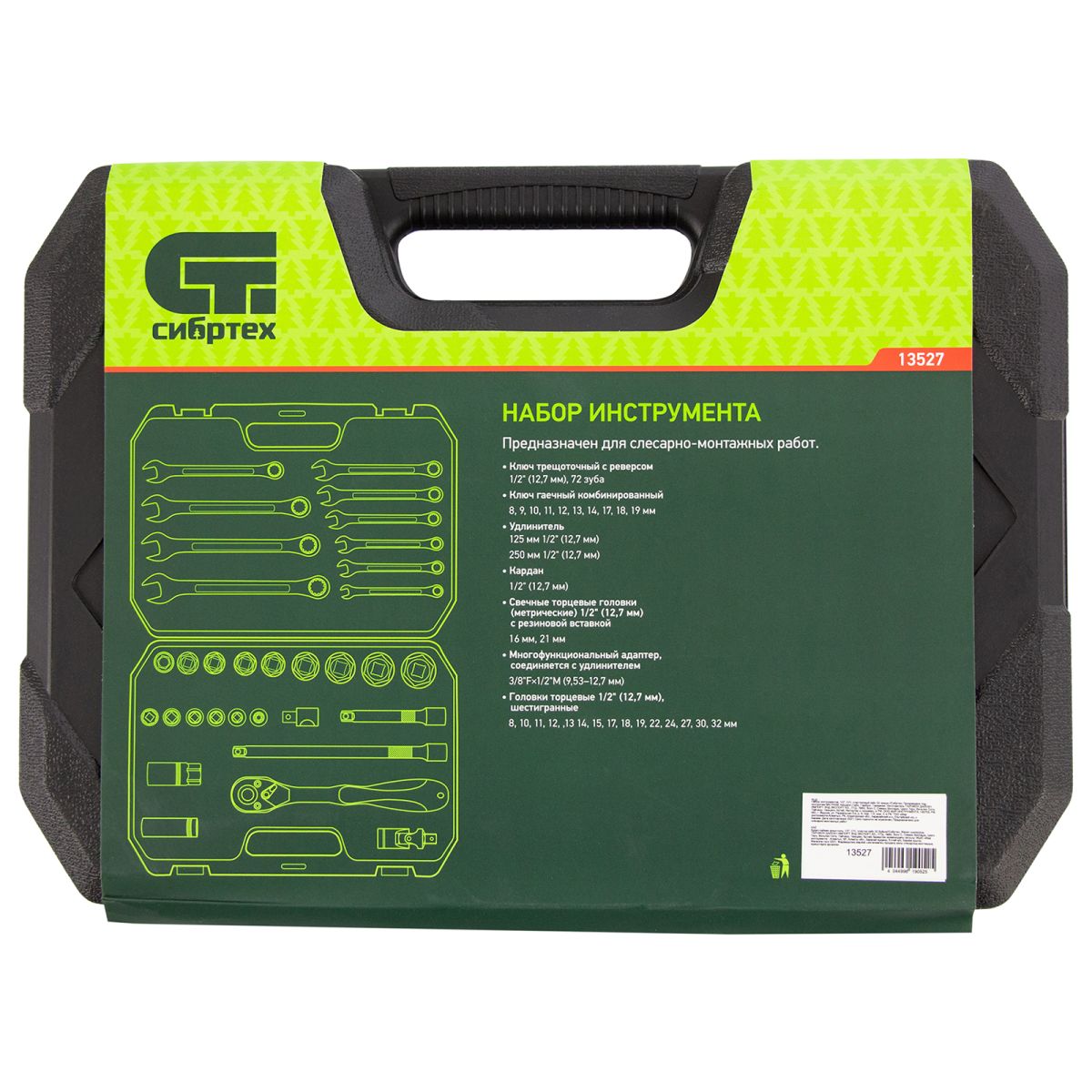 Набор инструментов Сибртех 13527, 1/2 дюйма, в пластиковом кейсе, состоит из 32 предметов, изготовленных из стали CrV-группы и предназначенных для закручивания и откручивания резьбовых крепежей. Имеющиеся в комплекте 2 удлинителя и кардан облегчают работу в труднодоступных местах. Набор будет полезен для ремонта автомобиля в гараже, пригодится также и в быту.
