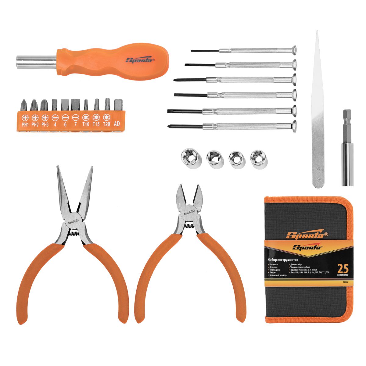 Набор Sparta 13534 включает 25 предметов, необходимых при проведении слесарно-монтажных работ. Он рассчитан на бытовое использование, поэтому будет полезен в хозяйстве. С помощью часовых отверток можно провести точные работы, биты и торцевые головки позволяют осуществить монтаж/демонтаж резьбовых соединений, вспомогательный инструмент пригодится для захвата и удержания деталей, удлинитель используется для работы в труднодоступных местах.
