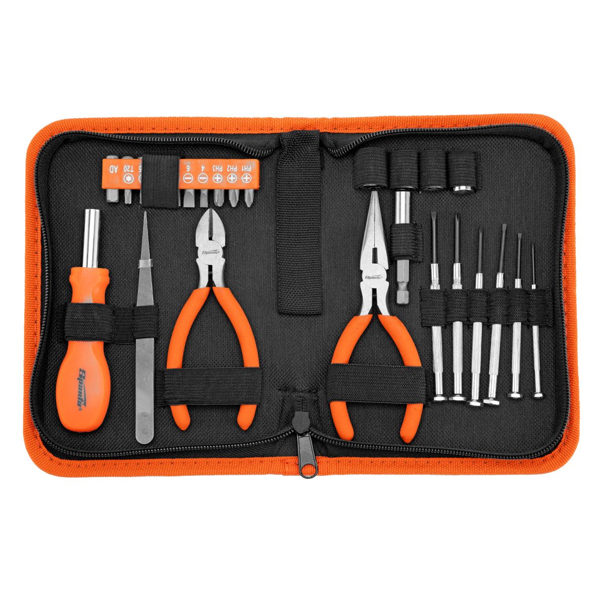 Длинногубцы - 1 штБокорезы - 1 штГоловки 7, 8, 9, 10 - 4 штОтвертки для точных работ SL, PH - 6 штОтвертка для бит - 1 штАдаптер для бит - 1 штБиты PH, SL, T - 9 штПинцет - 1 штДержатель для бит с магнитом - 1 штКейс - 1 штГоловки - 1 штПассатижи - 1 шт