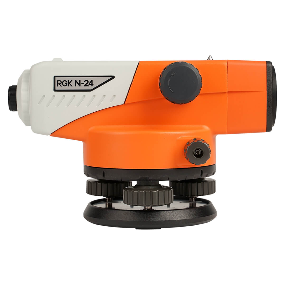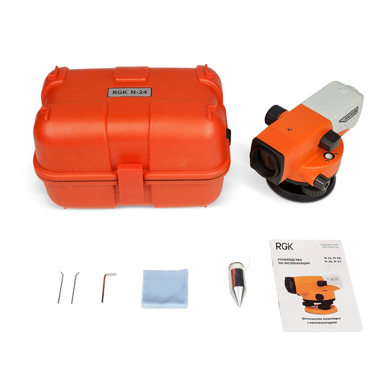 Стандартная комплектация: оптический нивелир RGK N-24, нитяной отвес, юстировочный набор, руководство по эксплуатации, транспортировочный кейс.