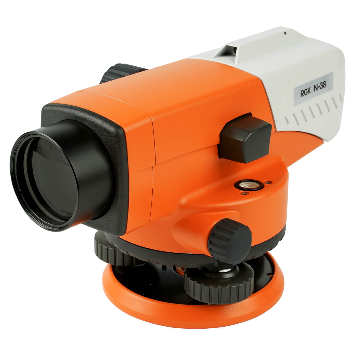 Высокая точность оптики нивелира усилена использованием компенсатора с магнитным демпфером. Система компенсации устраняет отклонение по горизонтали в пределах 15’ с точностью 0,2’, благодаря чему RGK N-38 обеспечивает стабильное изображение в зрительной трубе, а измерения сохраняют точность даже в сложных условиях работы. Для первоначальной установки нивелира в горизонтальное положение используются плавные наводящие винты, а контроль горизонта производится с помощью встроенного пузырькового уровня прибора.