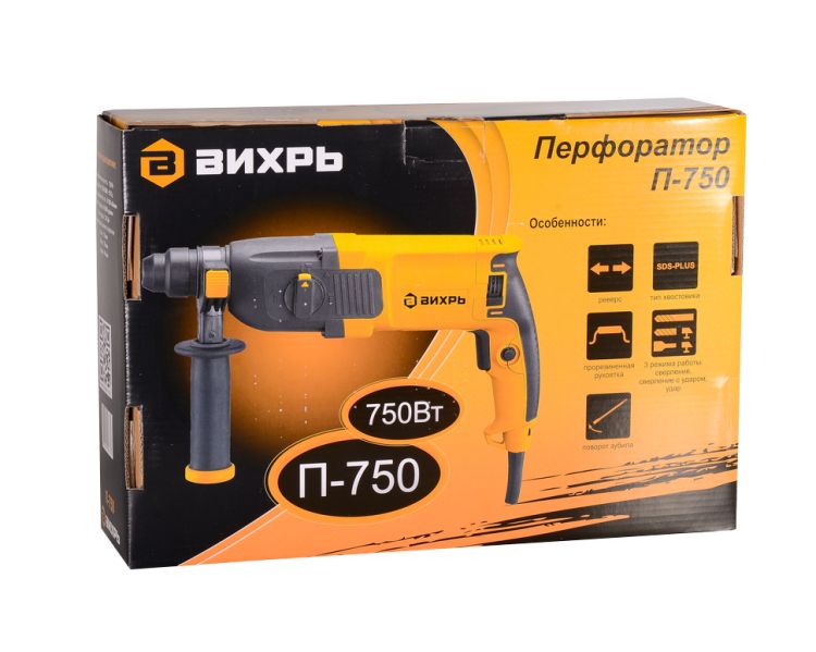 Перфоратор Вихрь П-750 оборудован надежным электродвигателем мощностью 750 Вт, обеспечивающим бесперебойную работу во время выполнения сложных задач. Перфоратор работает в двух режимах: сверление и сверление с ударом, оснащён электронной регулировкой числа оборотов.