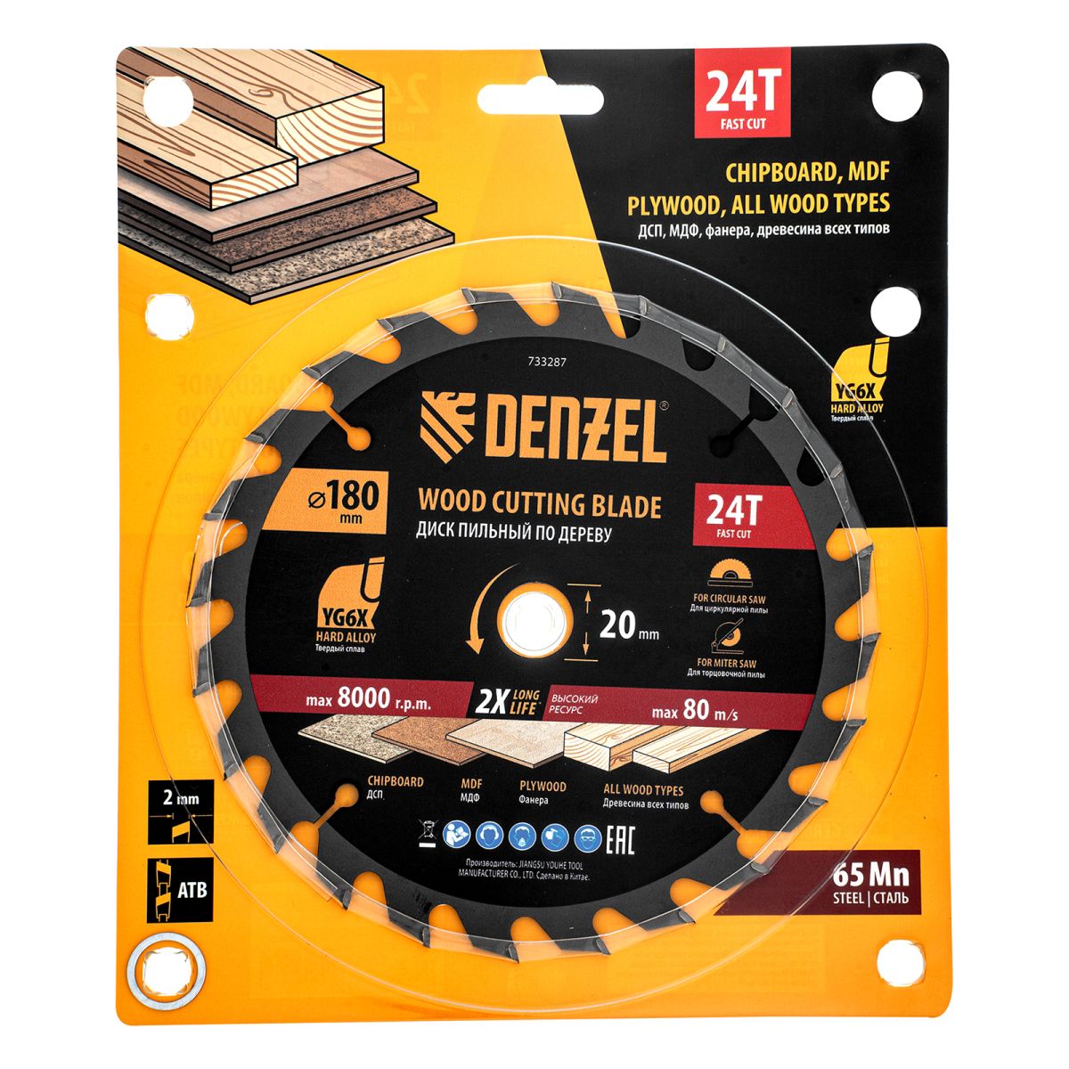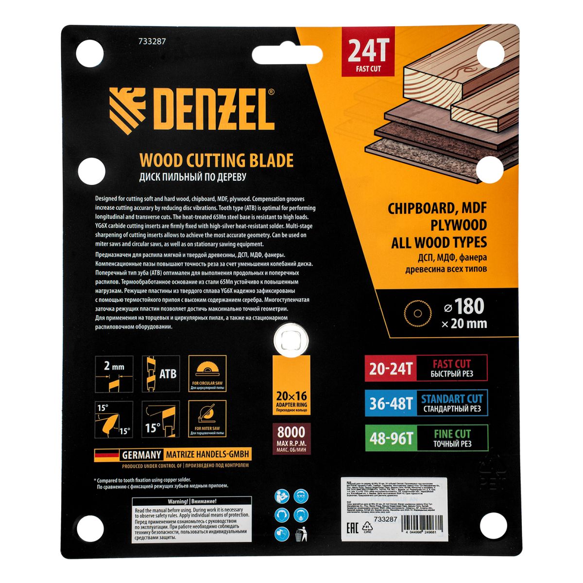 Пильный диск Denzel 733287 диаметром 180 x 20 мм, с 24 зубьями, предназначен для продольного и поперечного распила твердой и мягкой древесины, фанеры, МДФ, ДСП. 24 зубьев типа ATB с режущими пластинами оптимальной геометрии обеспечивают быстрый рез. Режущие пластины из твердого сплава YG6X сохраняют рабочие свойства при интенсивном использовании. Диск устанавливается на циркулярную, торцовочную пилу или на распиловочный станок. В комплект поставки входит переходное кольцо с 20 на 16 мм, что позволяет изменить посадочный размер и расширяет возможности использования диска.