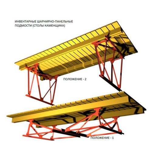 Подмости каменщиков шарнирные считаются одними из самых мощных в плане грузоподъемности. Их надежная конструкция позволяет выдерживать нагрузку 400кг/ м2.