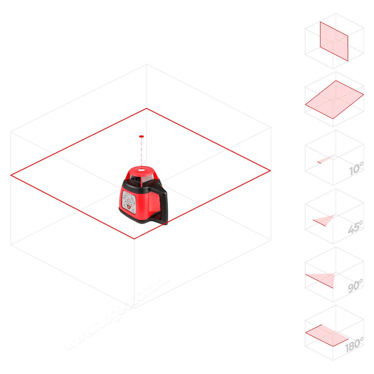 RGK SP-310 позволяет варьировать частоту вращения лазера: доступны значения 0, 60, 300 и 600 оборотов в минуту. Низкие частоты позволяют экономить батарею, а также пригодятся при построении сегмента. Более высокие частоты нужны для работы с приёмником и точного проецирования.