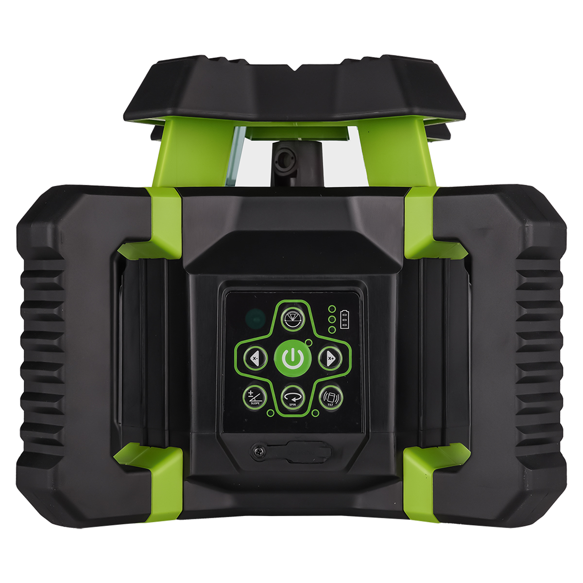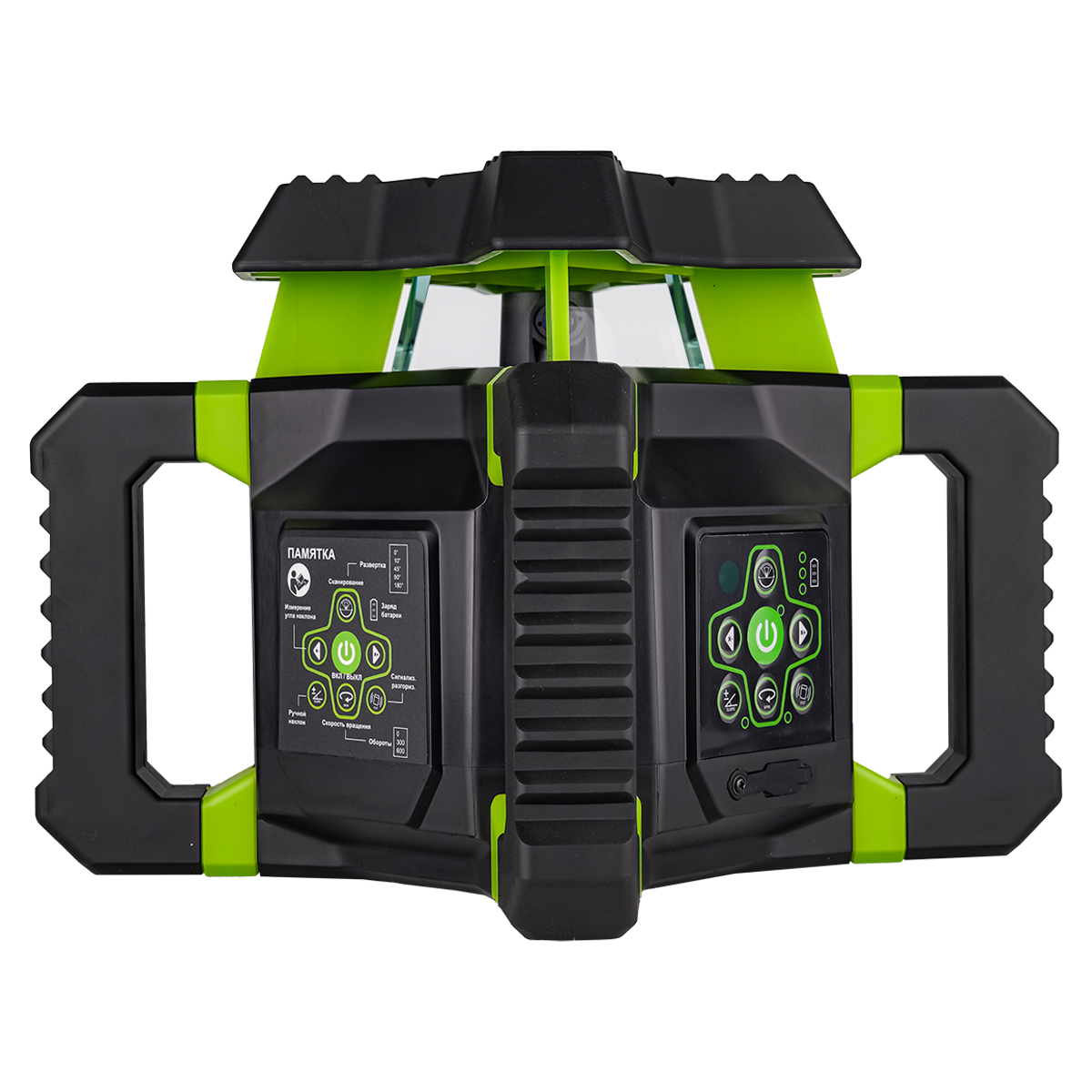 • 4 боковые ручки, благодаря параллельному расположению, позволяют устанавливать ротационный нивелир на любых горизонтальных поверхностях для проецирования отвесной плоскости при боковом выравнивании, исключая необходимость обязательного задействования штатива.