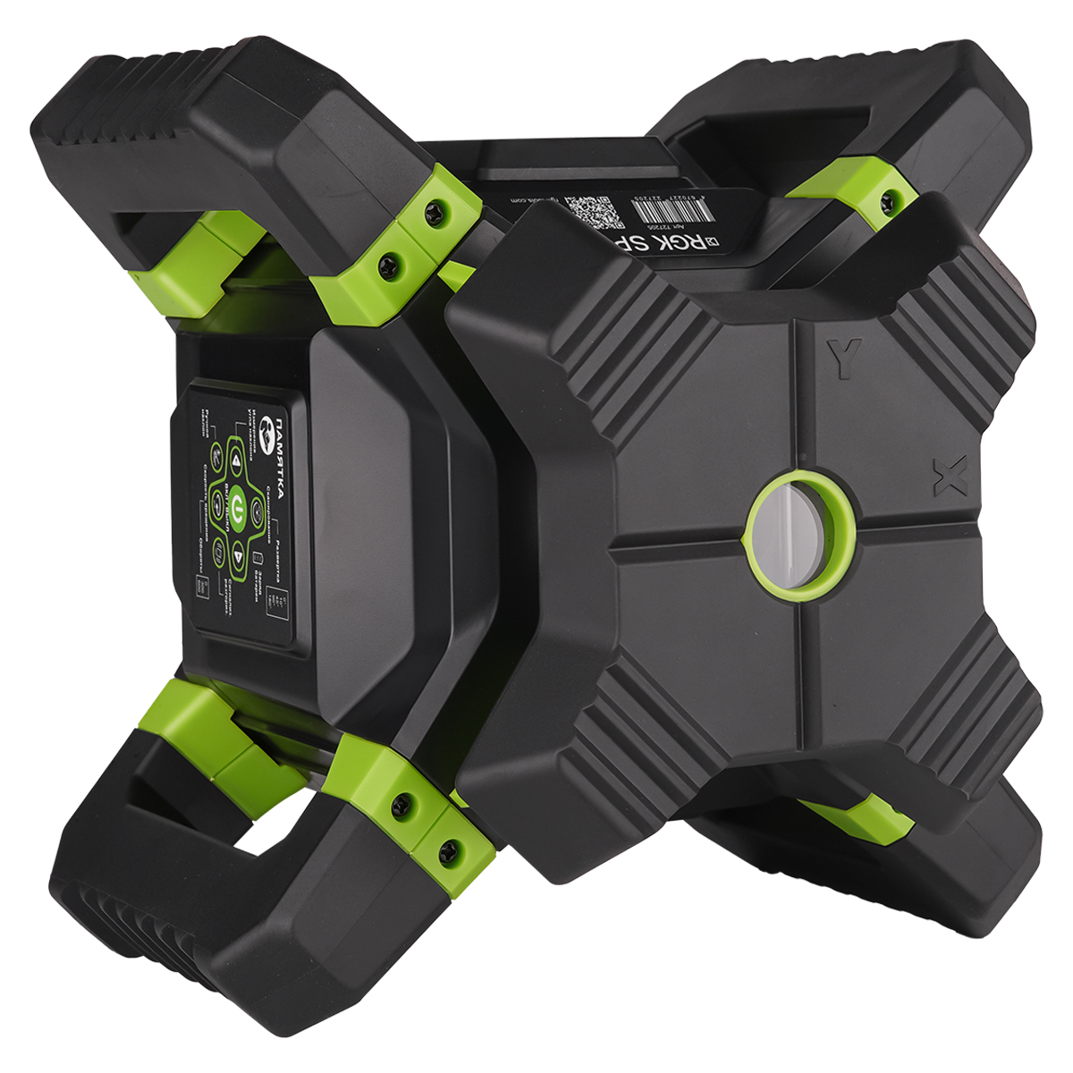 • Пульт дистанционного управления, который полностью дублирует функции кнопок на панели прибора, дает возможность удаленно изменять направление и скорость вращения ротационной системы, устанавливать ширину сектора проецируемой плоскости и задавать требуемый уклон по осям X и Y.