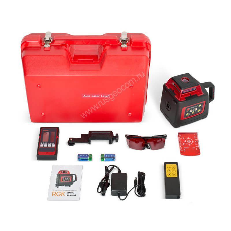 Ротационный нивелир RGK SP-400 предназначен для работы с приёмником на расстоянии до 400 метров. Точность горизонтальной плоскости ±1 мм на 10 м, а вертикальной — ±1,5 мм на 10 м. Выравнивание выполняется с помощью сервоприводов в диапазоне ±5°. При выходе за пределы автовыравнивания лазер остановит вращение и отключится.