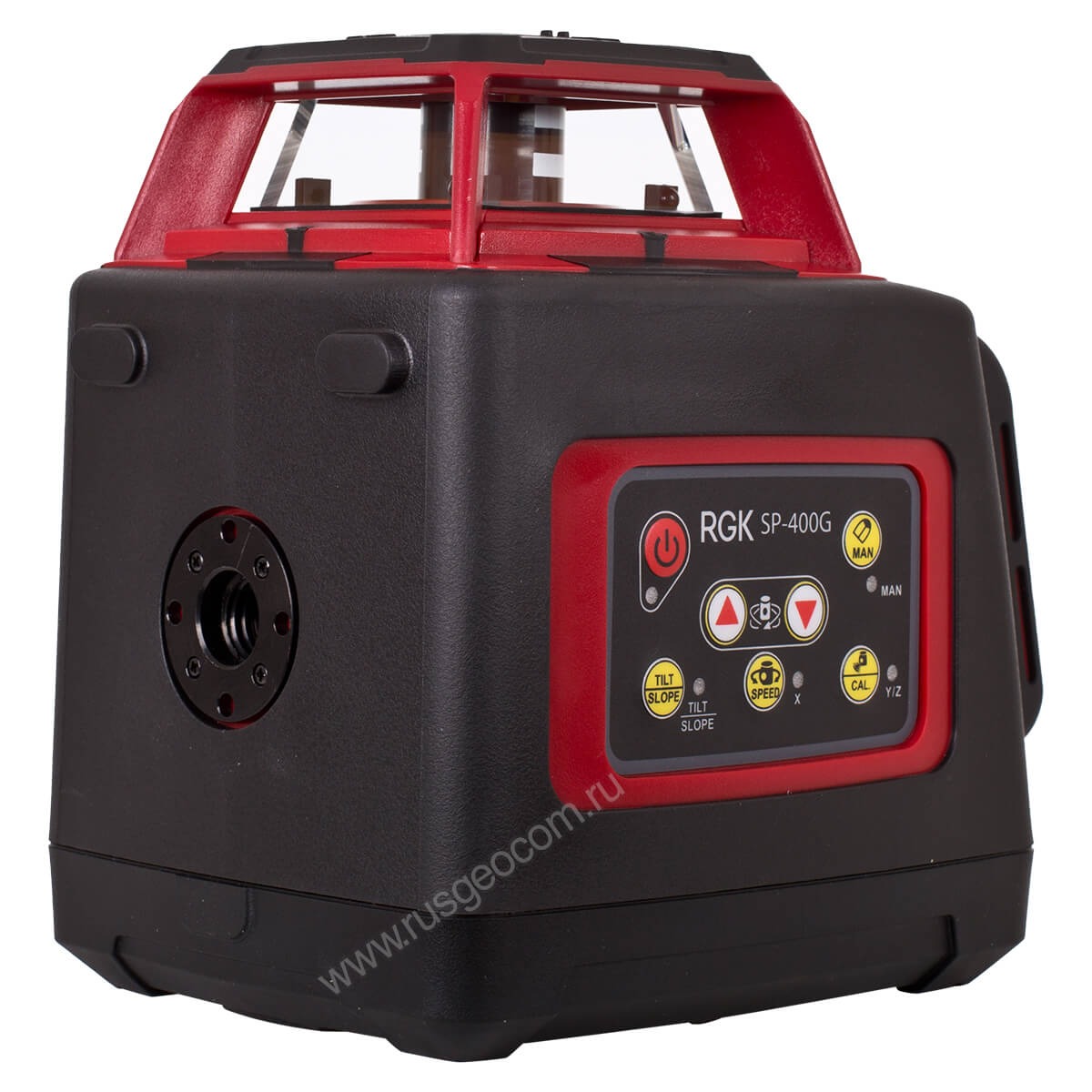 Источник питания — перезаряжаемый аккумулятор, обеспечивающий до 24 часов непрерывной работы. Для зарядки батареи ротационный нивелир RGK SP-400G разъём в основании прибора, закрытый резиновой заглушкой.
