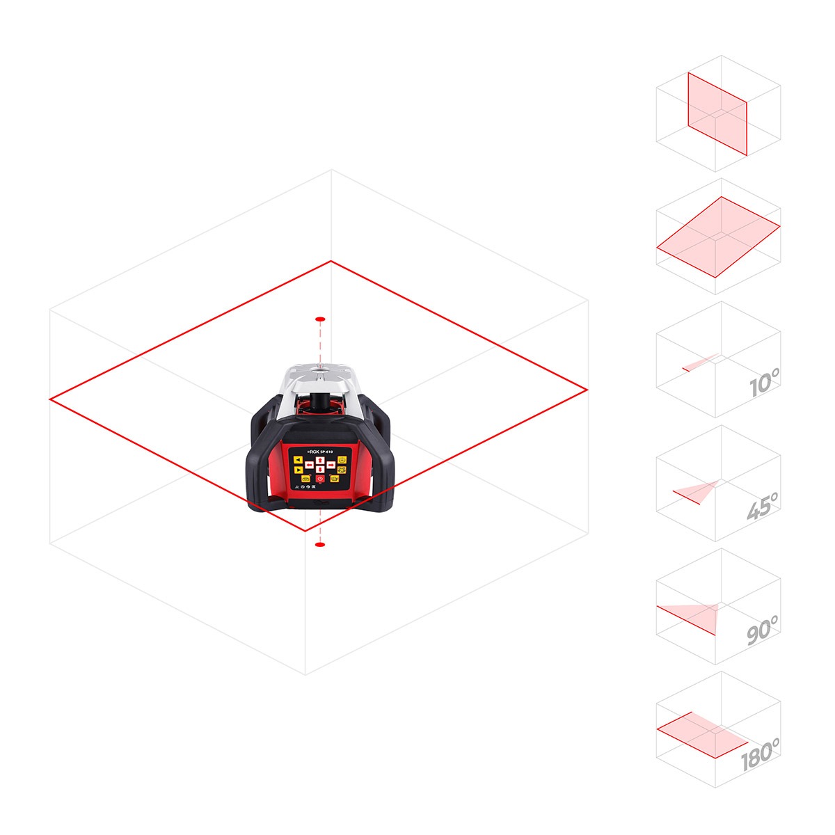 Лазерный ротационный нивелир RGK SP-610 имеет переменную частоту вращения. Отключение ротационного механизма будет удобно для проведения точечной разметки. Низкая частота вращения помогает экономить заряд батареи и пригодится при построении секторов или работе на небольшой дистанции. Высокая частота будет полезна при работе с приёмником.