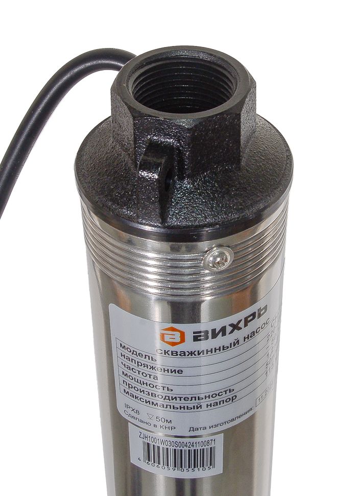 1200 Вт, напор – 115 м, 50 л/мин, Ø выхода - 1”, погружение до 60 м, Ø - 75 мм насосная часть - пластик, песка не более 180 г/м³, кабель - 65 м