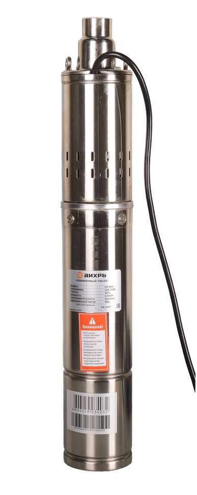 550 Вт, напор – 90 м, 25 л/мин, Ø выхода - 1”, погружение до 35 м, Ø - 90 мм, насосная часть - хром. сталь, песка не более 50 г/м³, кабель - 20 м