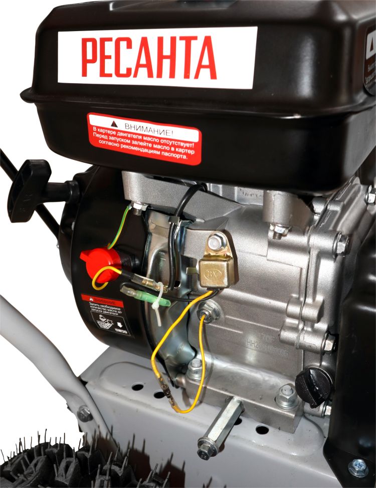 Рабочая система снегоуборщика Ресанта представляет собой снегозаборный желоб со шнеком, а также вентилятор в форме крыльчатки и желоб для выброса снега. Агрегат приводится в действие четырехтактным поршневым одноцилиндровым бензиновым двигателем внутреннего сгорания с воздушным охлаждением.