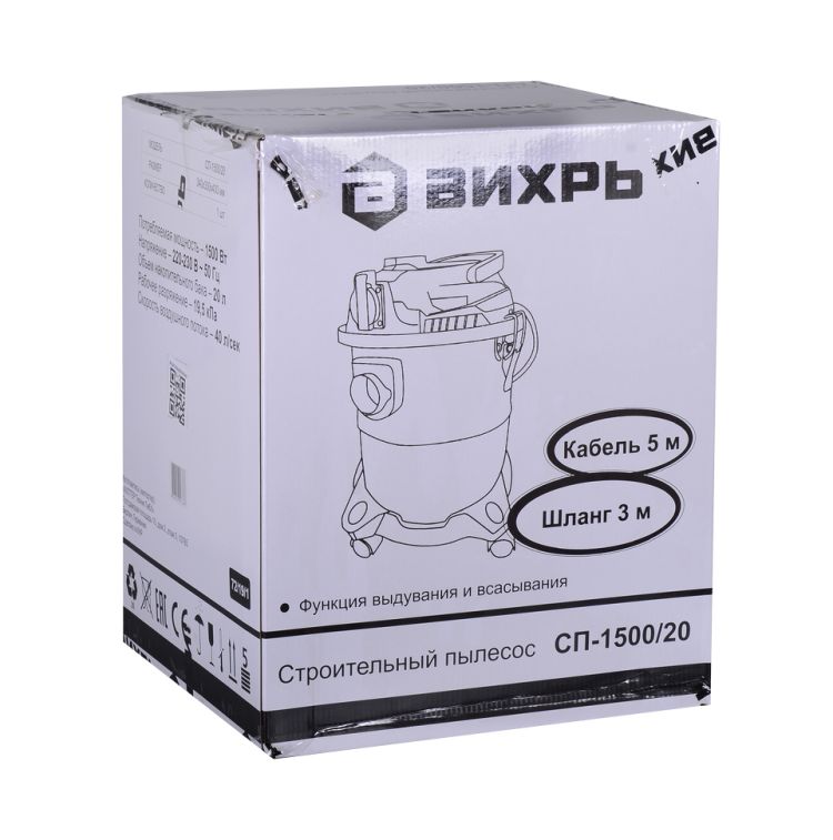 Строительный пылесос СП-1500/20 Вихрь предназначен для сухой и влажной уборки помещений, а также для совместного использования с электроинструментом при принудительном удалении продуктов сгорания, пиления. Может убирать крупные частицы мусора, а также воду.