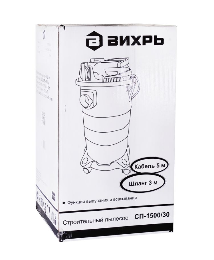 Строительный пылесос СП-1500/30 Вихрь предназначен для сухой и влажной уборки помещений, а также для совместного использования с электроинструментом при принудительном удалении продуктов сгорания, пиления. Может убирать крупные частицы мусора, а также воду.